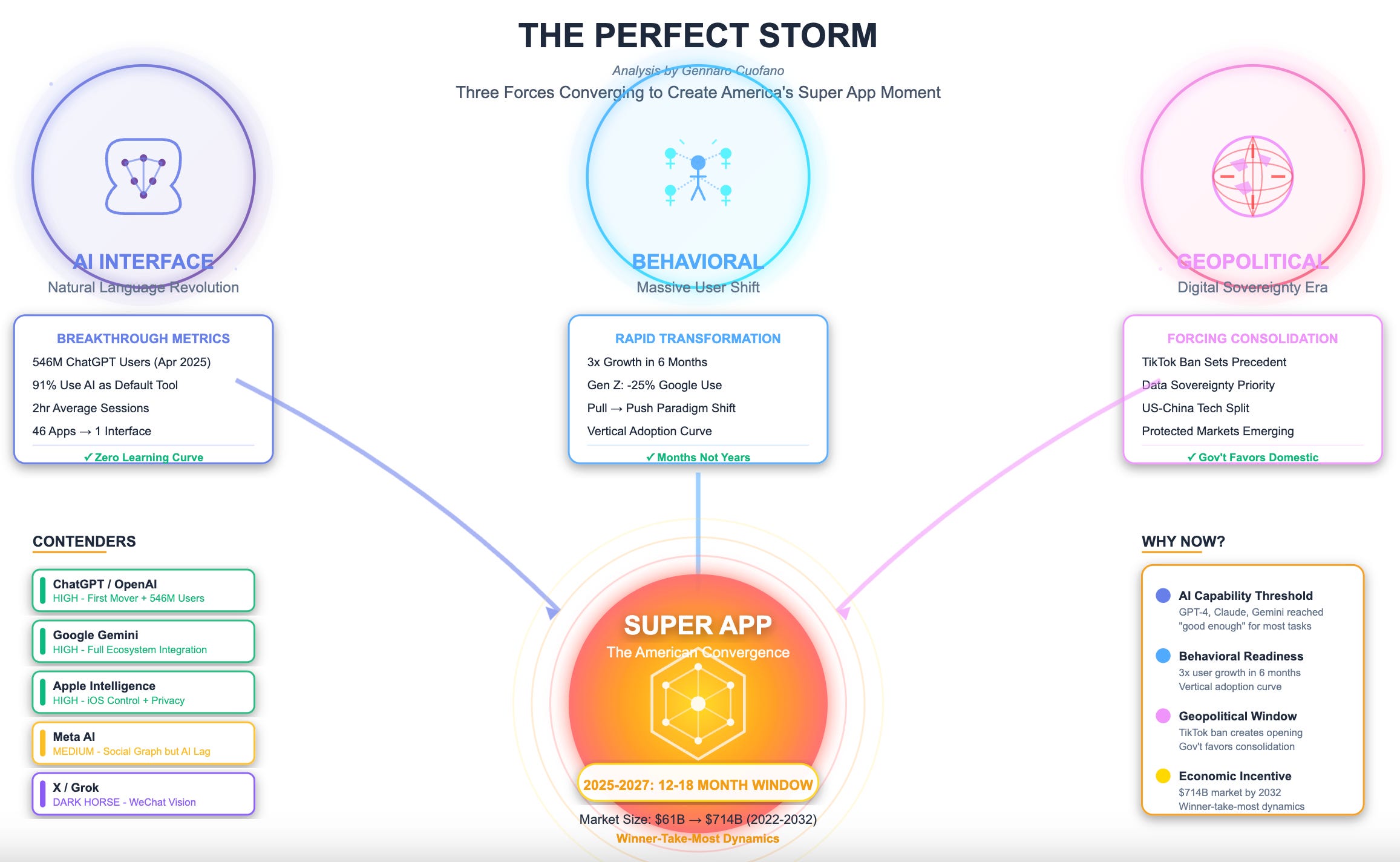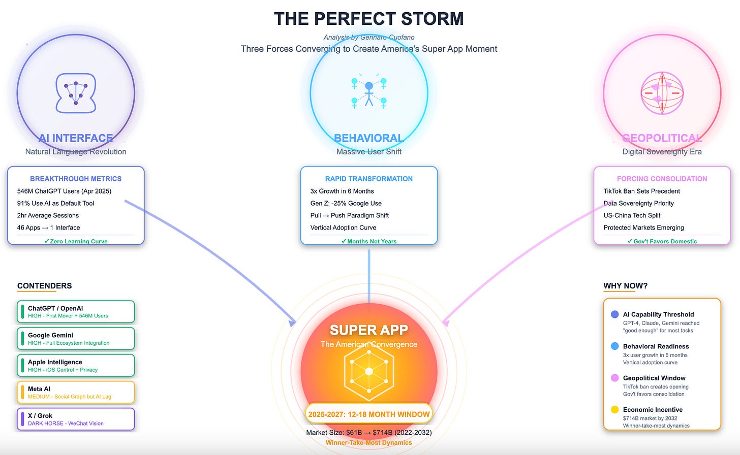 The convergence of three powerful forces is creating an unprecedented opportunity for super app consolidation. AI as the universal interface eliminates the friction that prevented super apps in the West through natural language interaction.