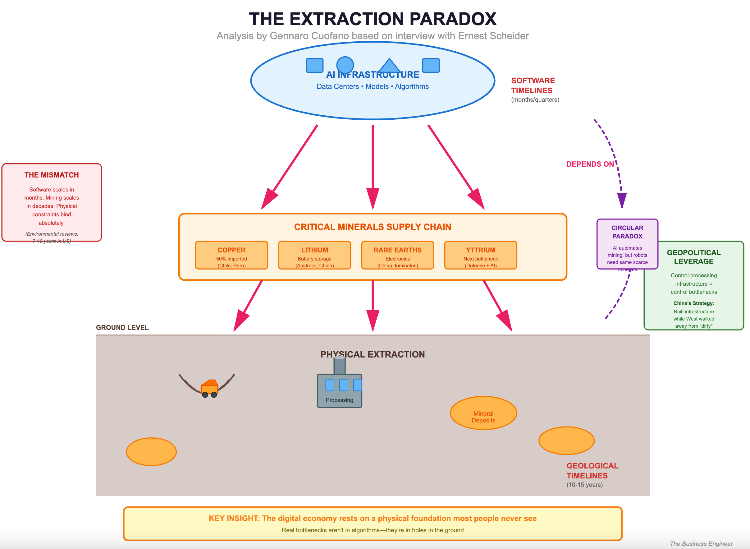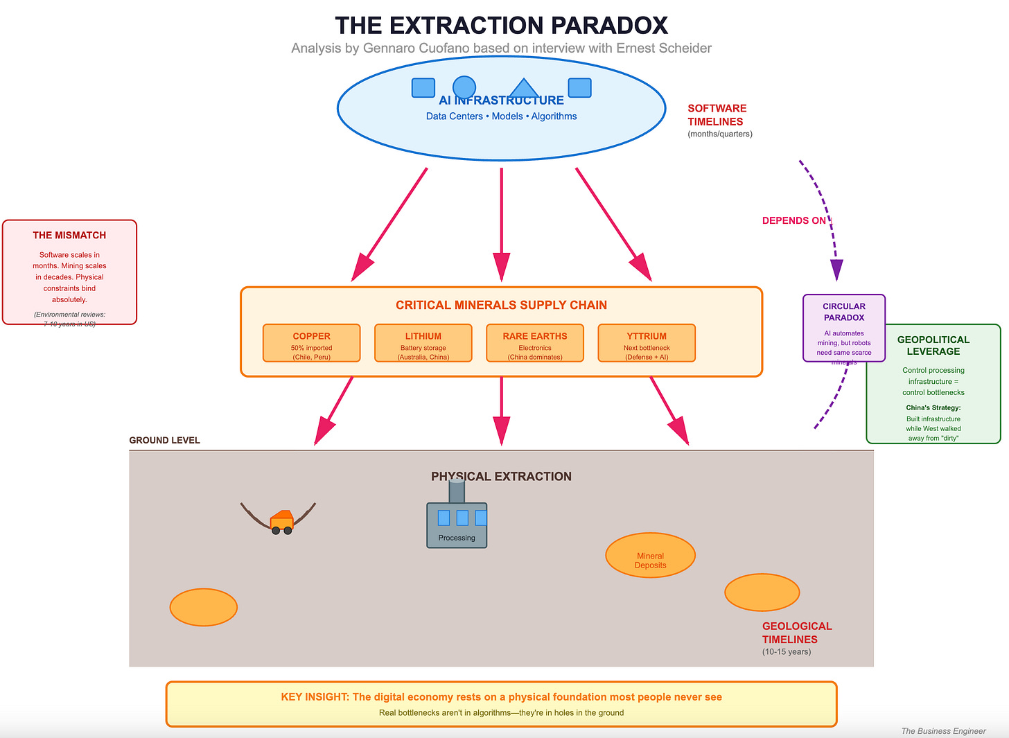 The conversation with Ernest Scheyder, author of The War Below, reveals a structural reality that sits uncomfortably with our narratives about technological progress. While AI companies compete on model performance and infrastructure scale, they’re all drawing from the same constrained pool of critical minerals—copper, lithium, rare earth elements—that require digging giant holes in the ground.