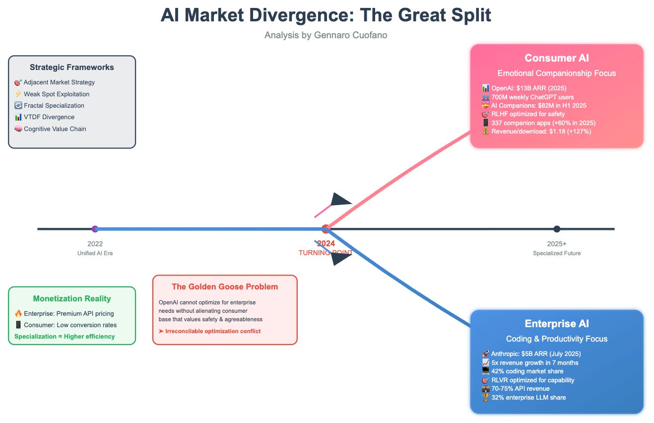 What we're witnessing isn't merely market segmentation, it's the emergence of two distinct value creation paradigms that are pulling AI companies toward irreconcilable strategic positions.