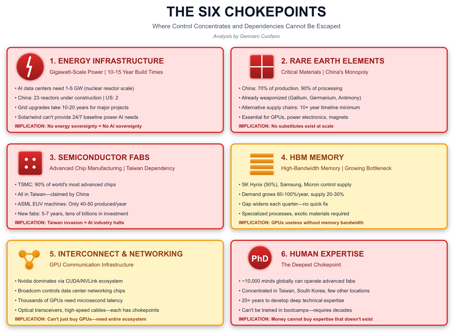 Unlike software, which can be copied infinitely at zero marginal cost, AI requires massive physical infrastructure that must be manufactured, powered, cooled, and maintained. And the chokepoints in this infrastructure are concentrated in the hands of strategic rivals, creating dependencies that make Apple’s reliance on China look quaint by comparison.