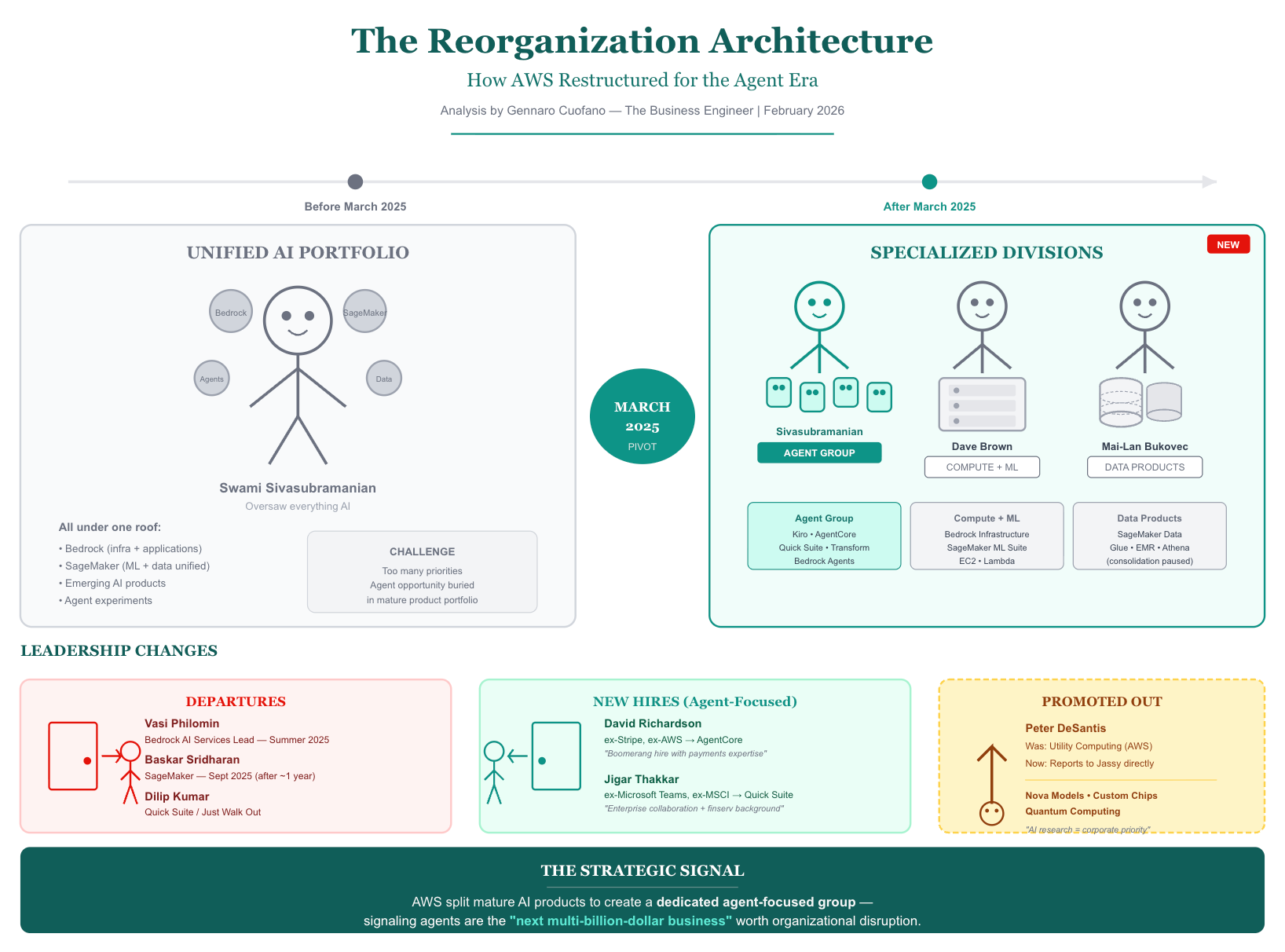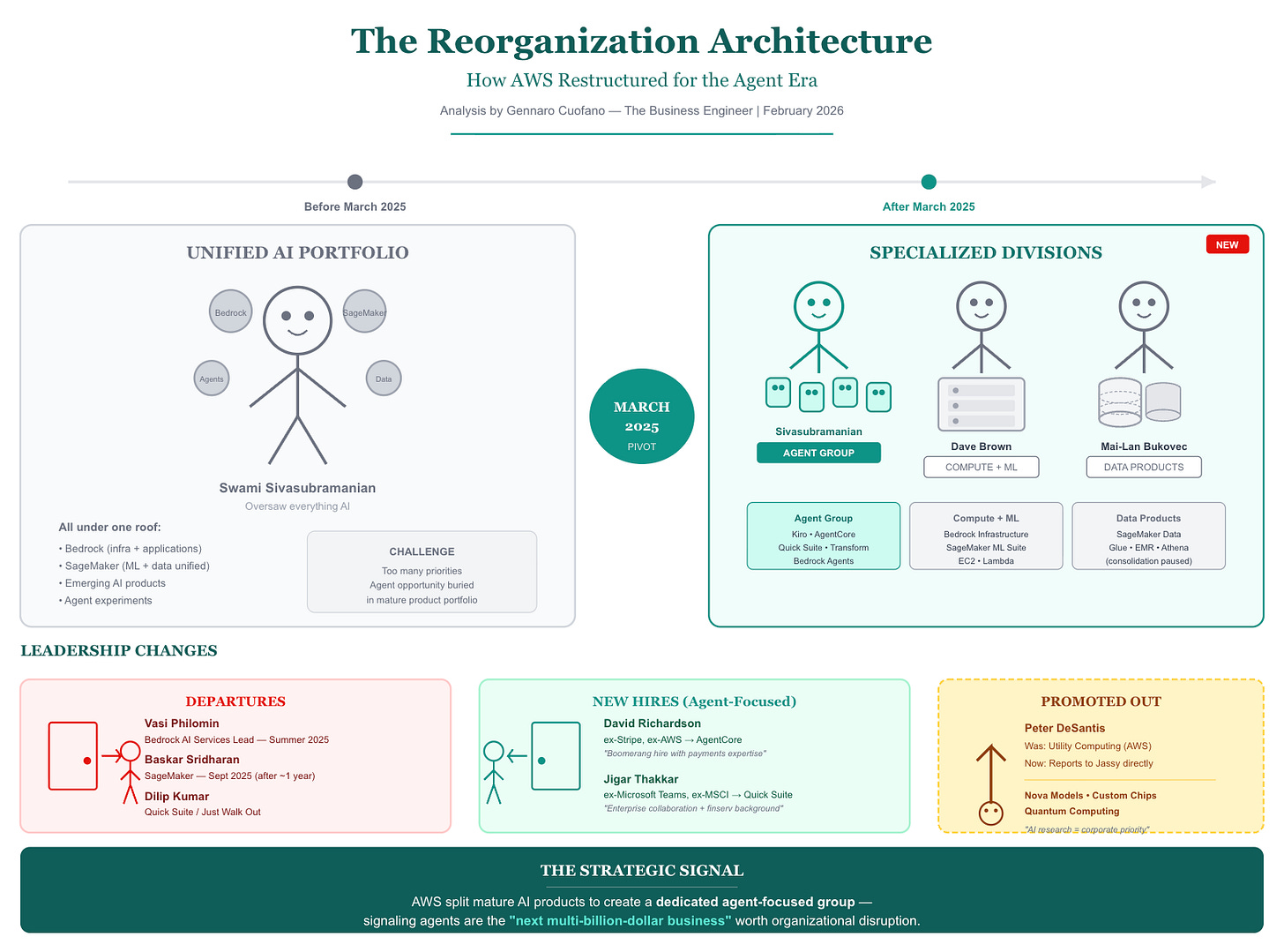 After March 2025: A new agent-focused group was created under Sivasubramanian, containing Kiro, AgentCore, Quick Suite, and Transform. Bedrock infrastructure moved to Dave Brown (Compute/ML). SageMaker was split—ML suite to Brown, data products to Mai-Lan Bukovec.