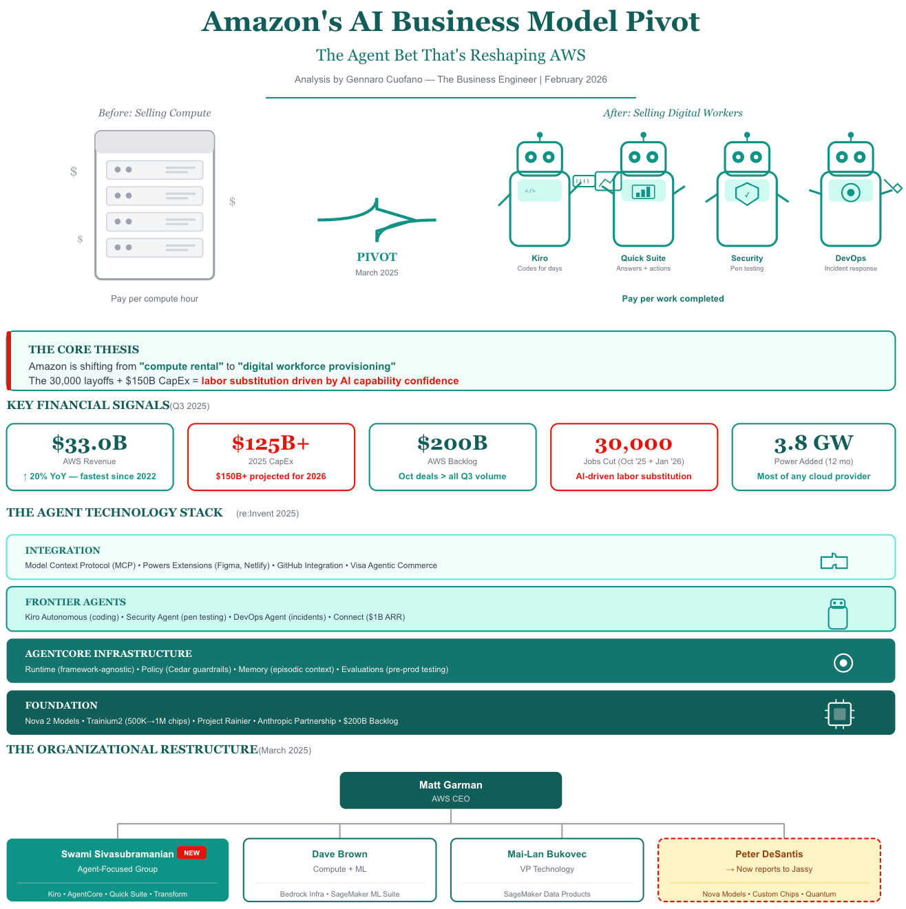 Amazon is executing a fundamental business model transformation, shifting AWS from an infrastructure provider to an agentic AI platform company. The March 2025 reorganization that created a standalone agent-focused group under Swami Sivasubramanian signals AWS’s bet that agentic AI represents its next multi-billion-dollar business line.