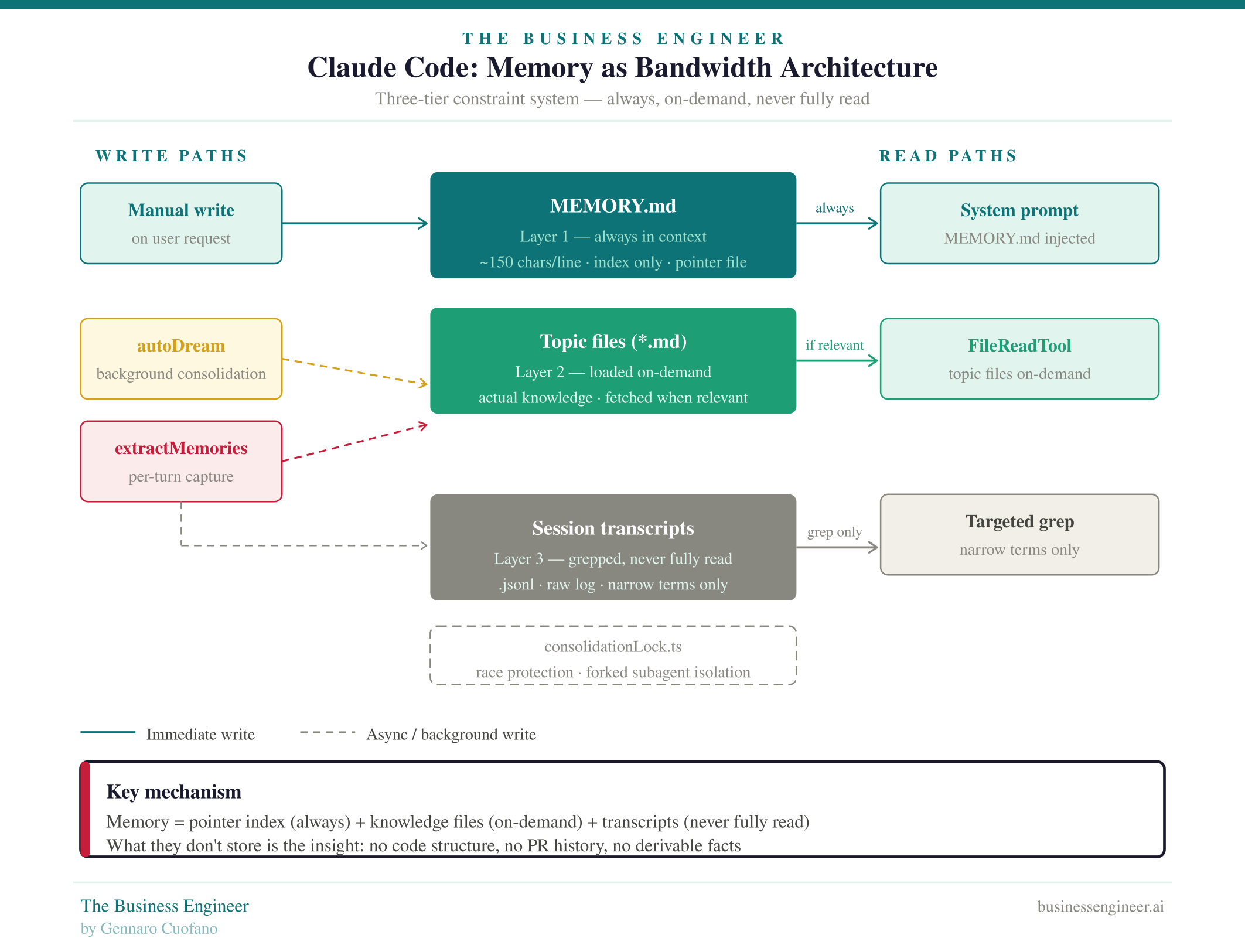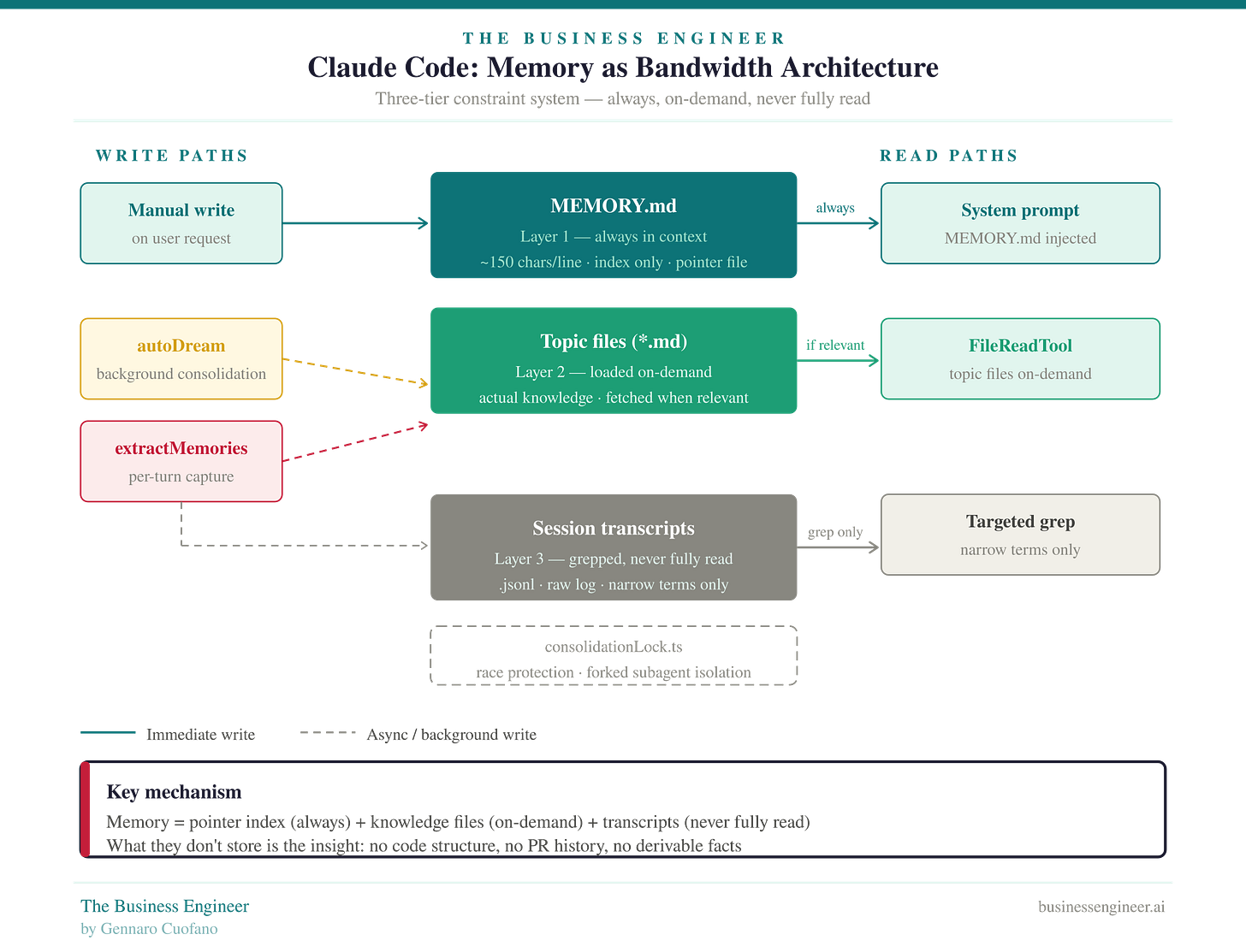 Layer 1 — MEMORY.md (always loaded): A pointer index, not a knowledge store. Every entry capped at roughly 150 characters per line. Always injected into the system prompt. Contains only references to where real knowledge lives — never the knowledge itself. Think of it as a routing table, not a database.