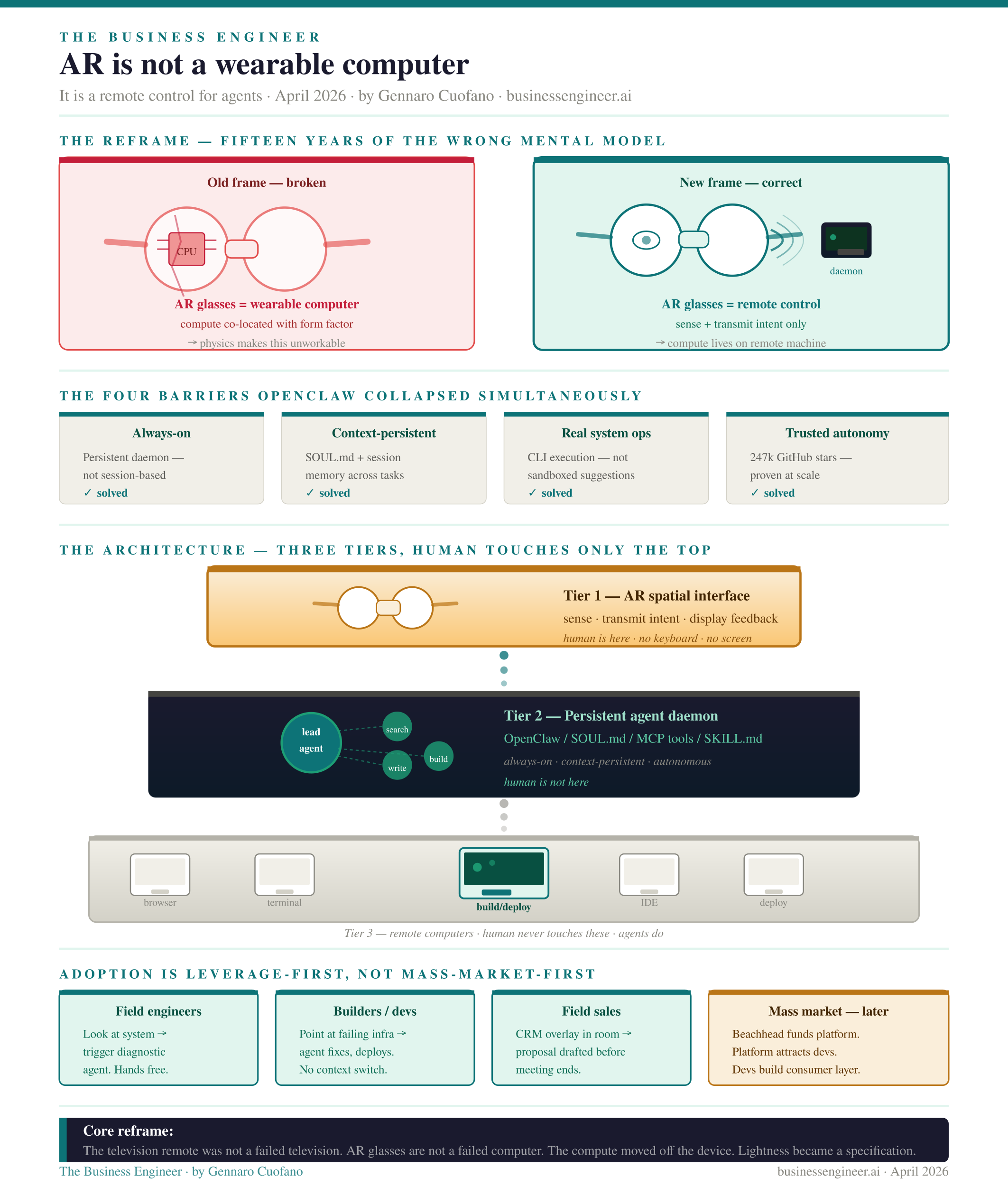 It was that the right frame required an architectural precondition that did not exist until 2025. Once that precondition arrived — in the form of the persistent agentic daemon — the correct mental model for AR became available for the first time.