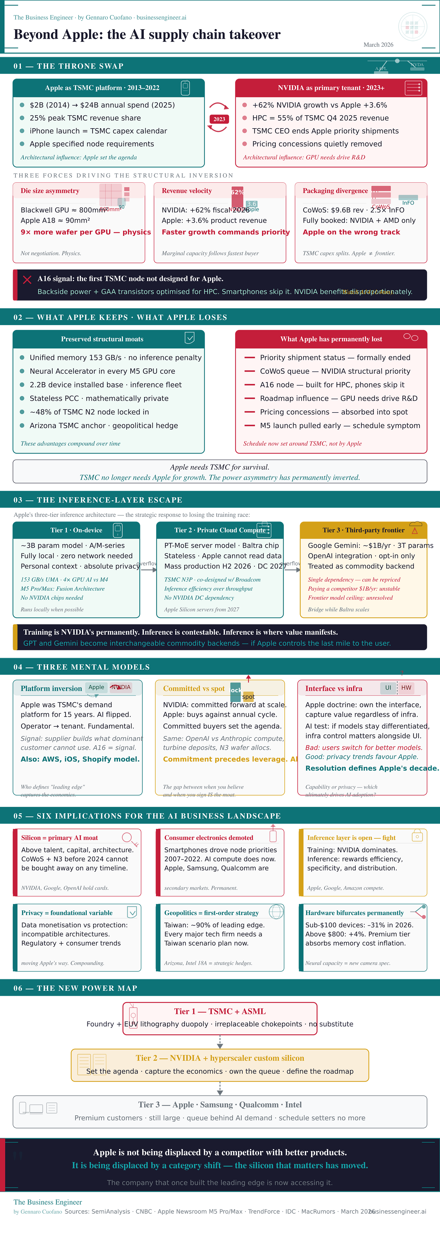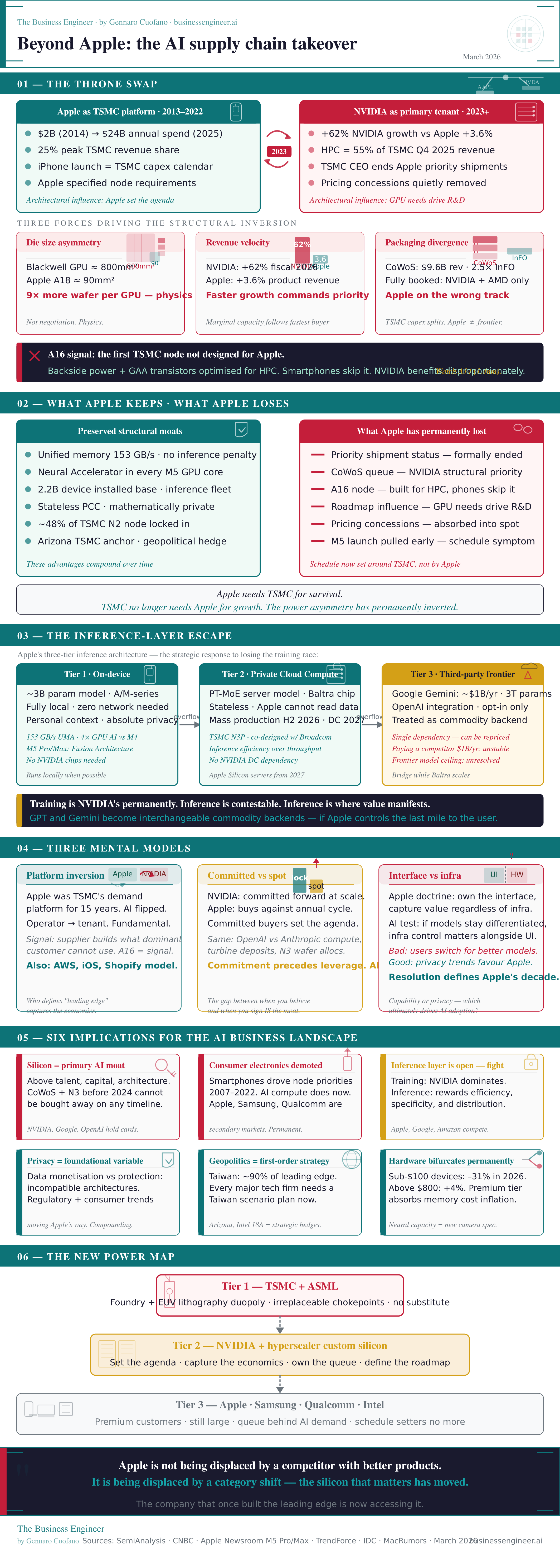 Apple built fifteen years of hardware supremacy on a single structural insight: control the silicon, and you control everything downstream. The AI era is proving that insight correct, but the silicon that matters has moved, and Apple does not own it.