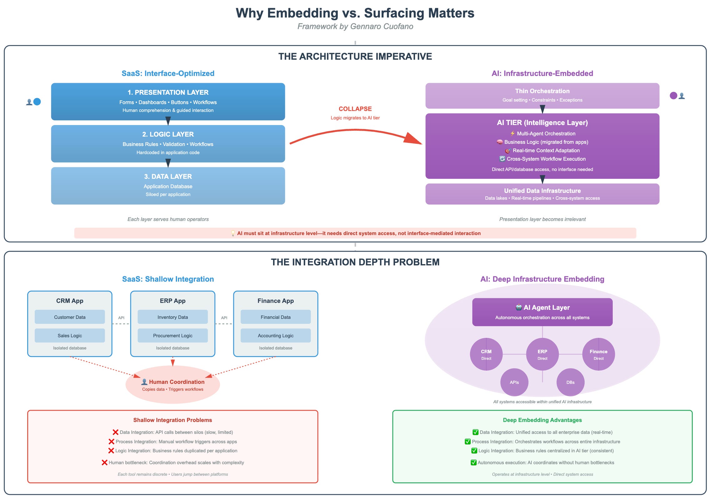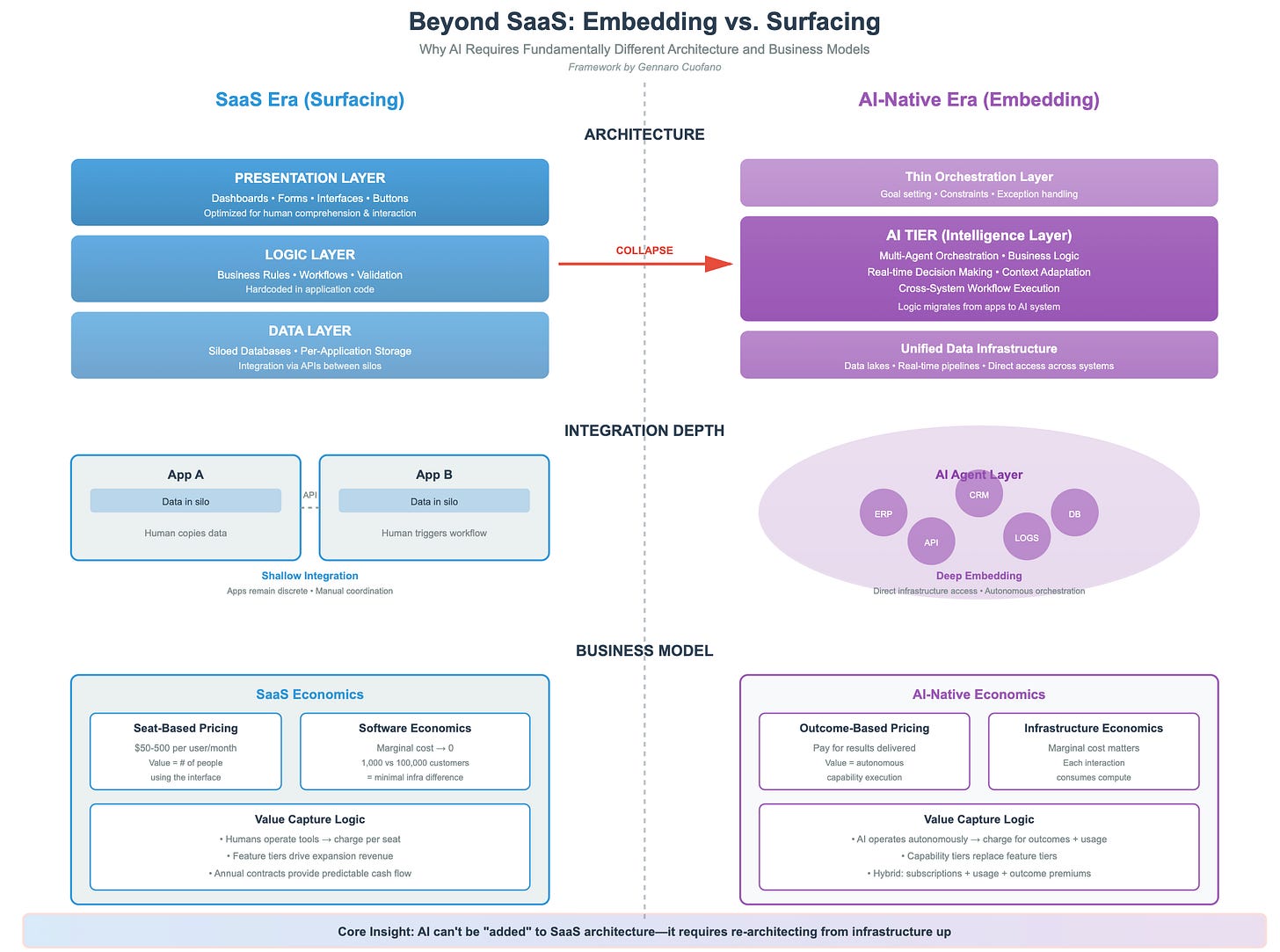 The critical distinction: SaaS is about surfacing capabilities for human operation. AI is about embedding intelligence that operates autonomously.