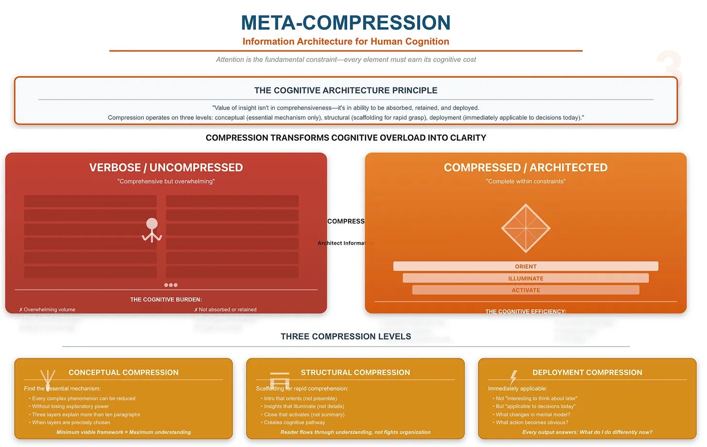 The most powerful insights aren’t found in the details—they’re found in the patterns that connect details. Meta-compression is the discipline of extracting higher-order principles from lower-order observations, creating insight that scales across contexts. One meta-insight is worth a thousand tactical observations.