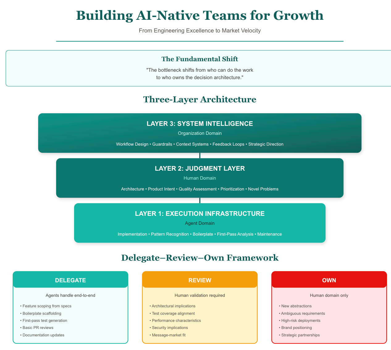 This has profound implications: growth velocity no longer depends primarily on headcount. It depends on how effectively you orchestrate human judgment with AI execution capability.