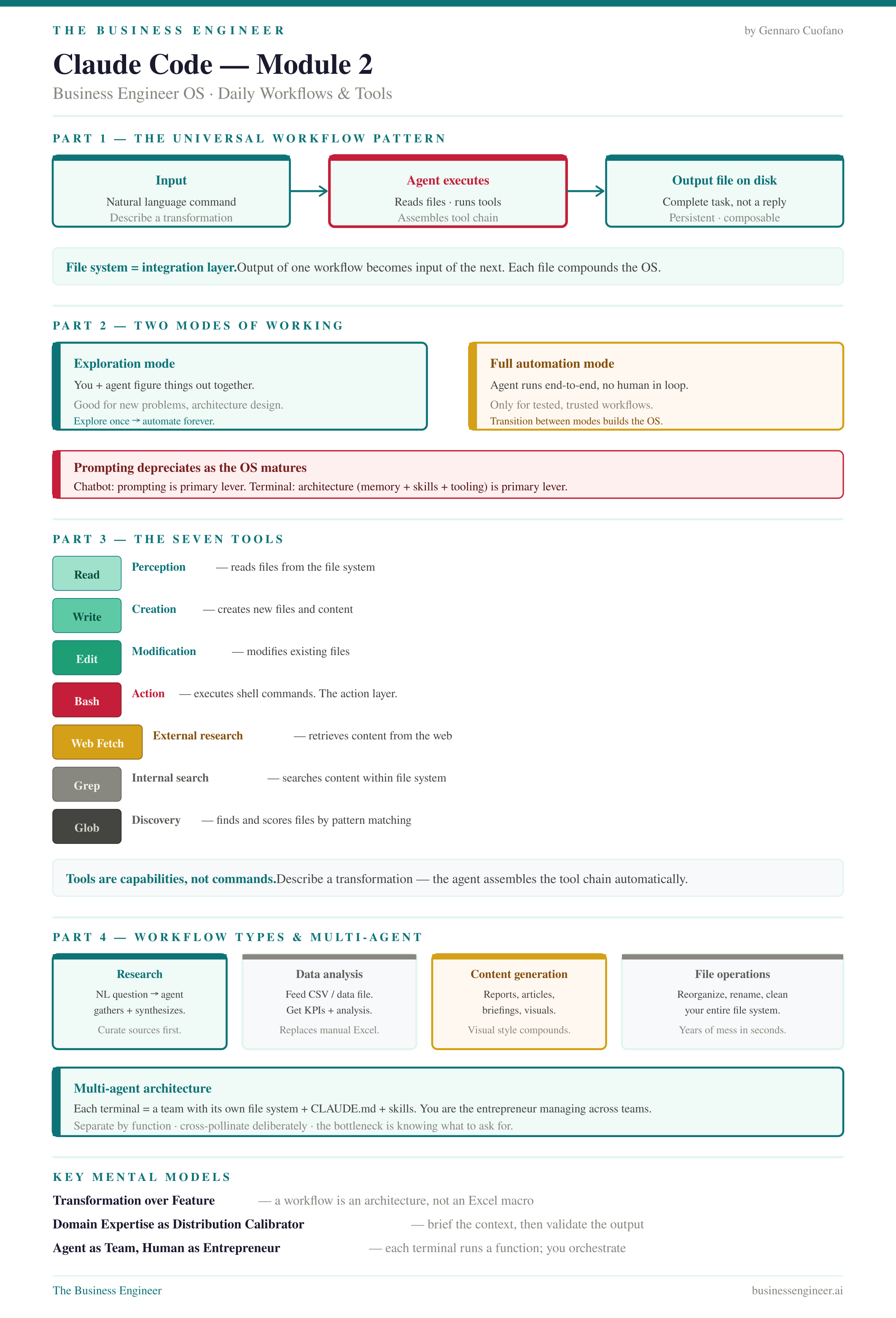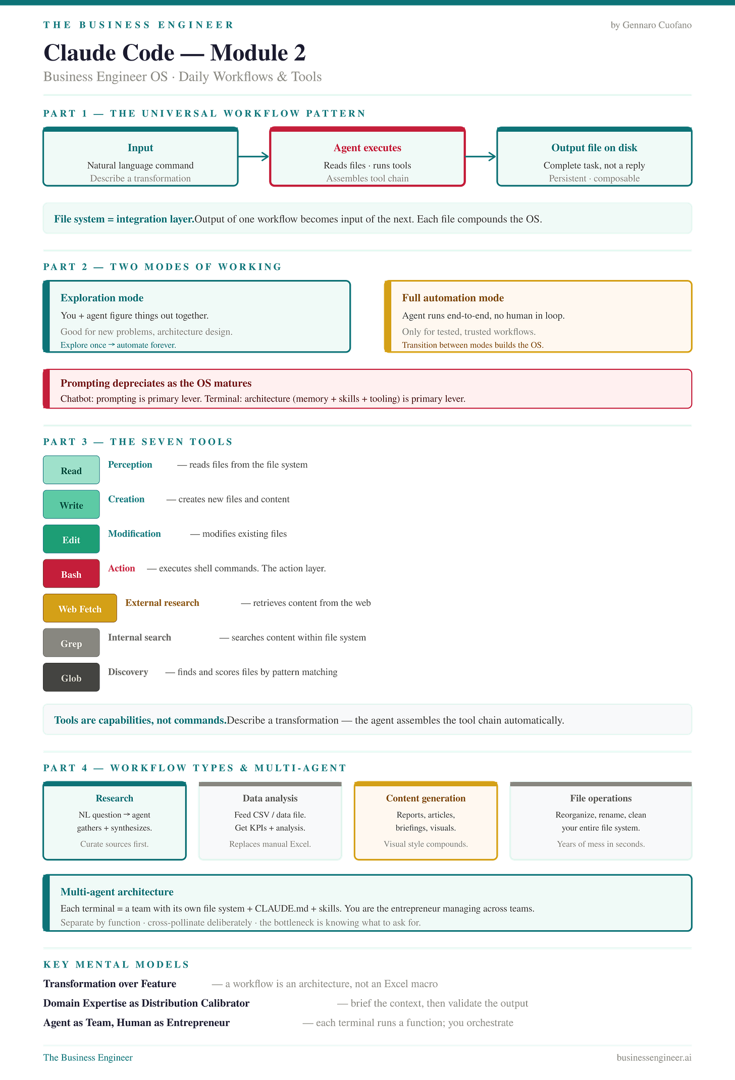 Module 2 moves from abstraction to architecture. Where Module 1 explained what Claude Code is, Module 2 explains how it works as a workflow engine — the universal pattern behind every task, the seven tools the agent uses under the hood, and the mental models you need to start building effective daily workflows.