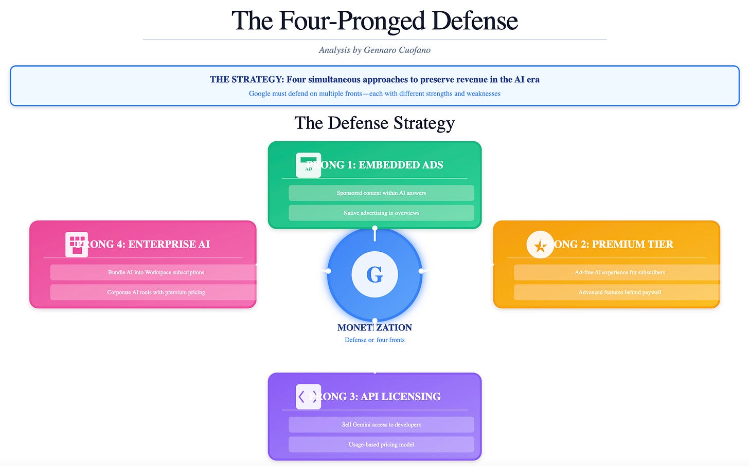 Google is executing a defensive transformation that reveals the fundamental tension facing all incumbent platforms: how to integrate AI without destroying your core business model. Their strategy shows sophisticated adaptation on multiple fronts, but it’s not just defense.