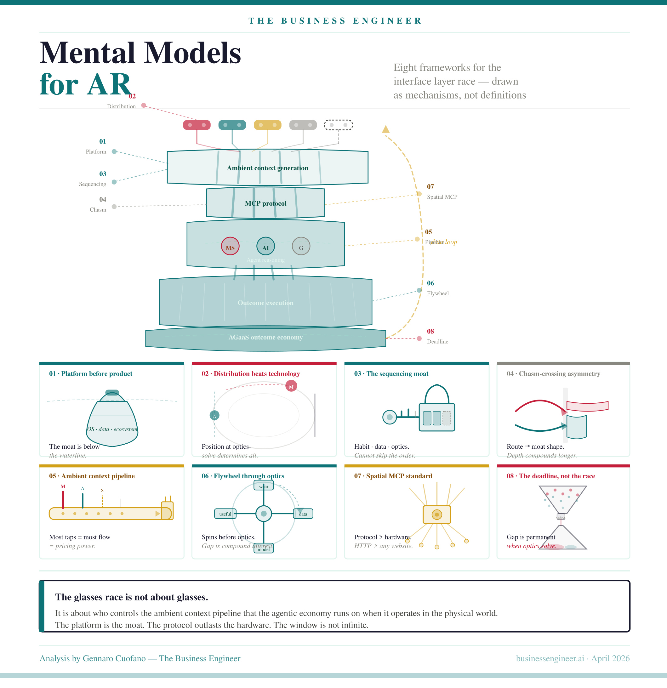 The central thesis, compressed: The glasses race is not about glasses. It is about who controls the ambient context pipeline that the agentic economy runs on when it operates in the physical world. The platform is the moat, not the product. Distribution compounds before optics solve. The spatial protocol outlasts every hardware generation. And the window is not infinite.