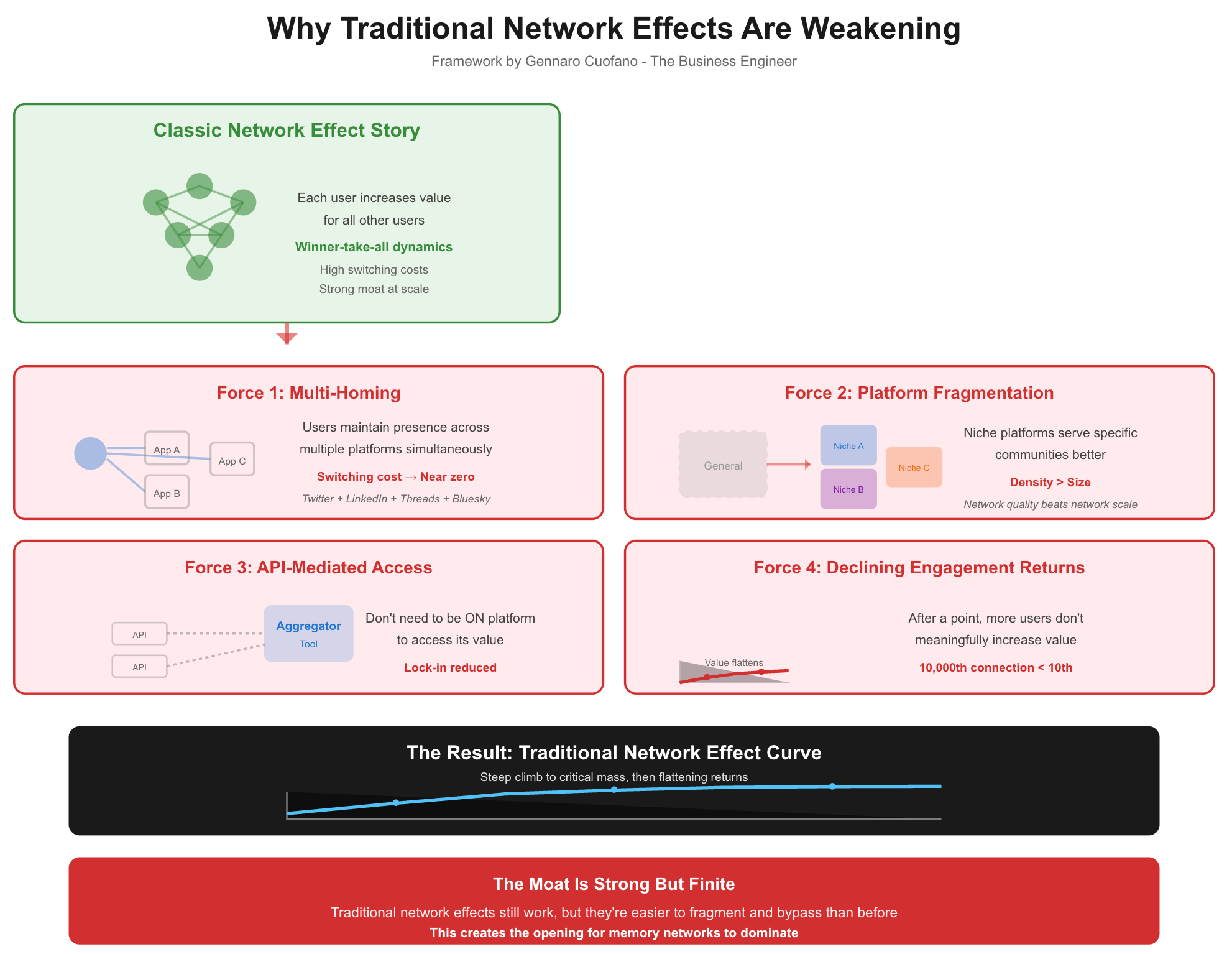 Multi-homing: Users now easily maintain presence across multiple platforms. The switching cost is near zero.