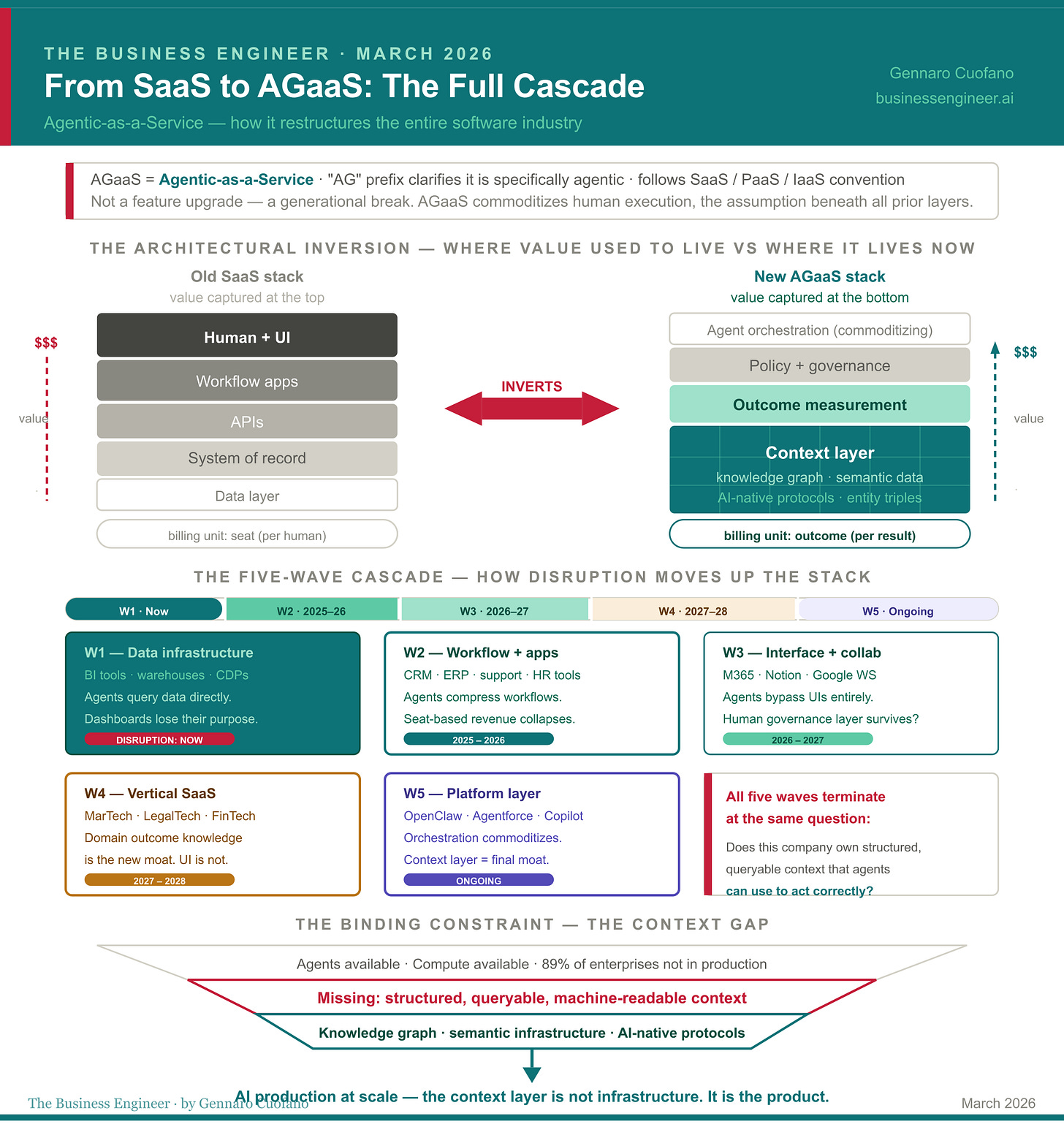 The generational framing matters. Every prior “as-a-service” shift rewrote the industry’s value hierarchy. IaaS ended the era of on-premise servers. PaaS commoditized deployment infrastructure. SaaS commoditized software installation. GaaS is commoditizing human execution — and that is a larger disruption than any that came before it, because human execution was the assumption underneath all previous layers.