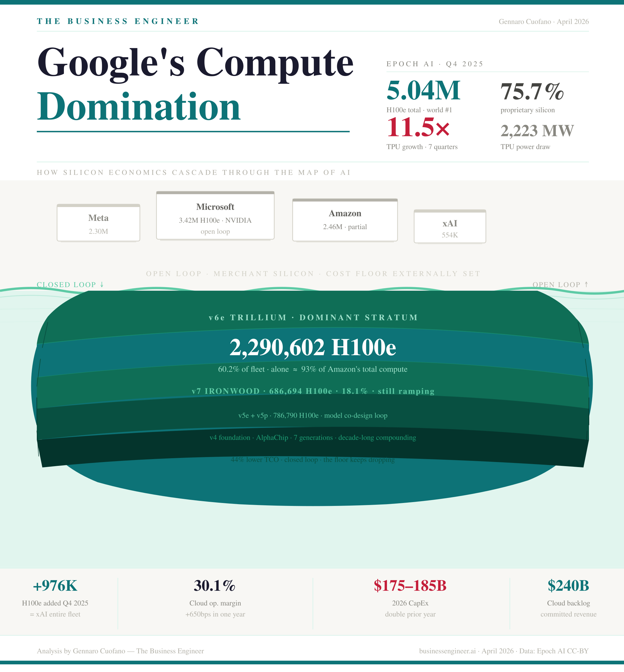 Here is the most important structural fact in AI infrastructure right now: Google’s TPU fleet grew 11.5x in seven quarters, it now draws more power than Microsoft’s entire AI compute stack, and the quarterly rate of additions is itself accelerating.