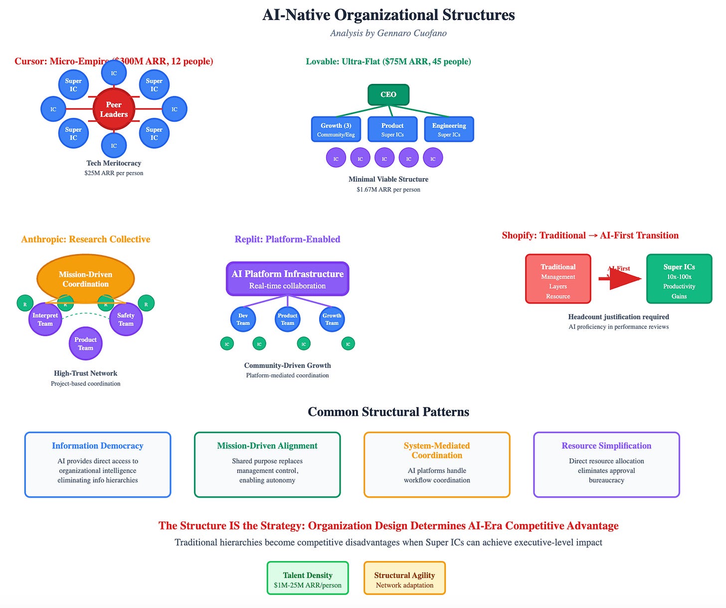 This analysis examines how different AI companies are architecting their organizations, and crucially, how these structural choices cascade into their business models, cultures, and competitive advantages.