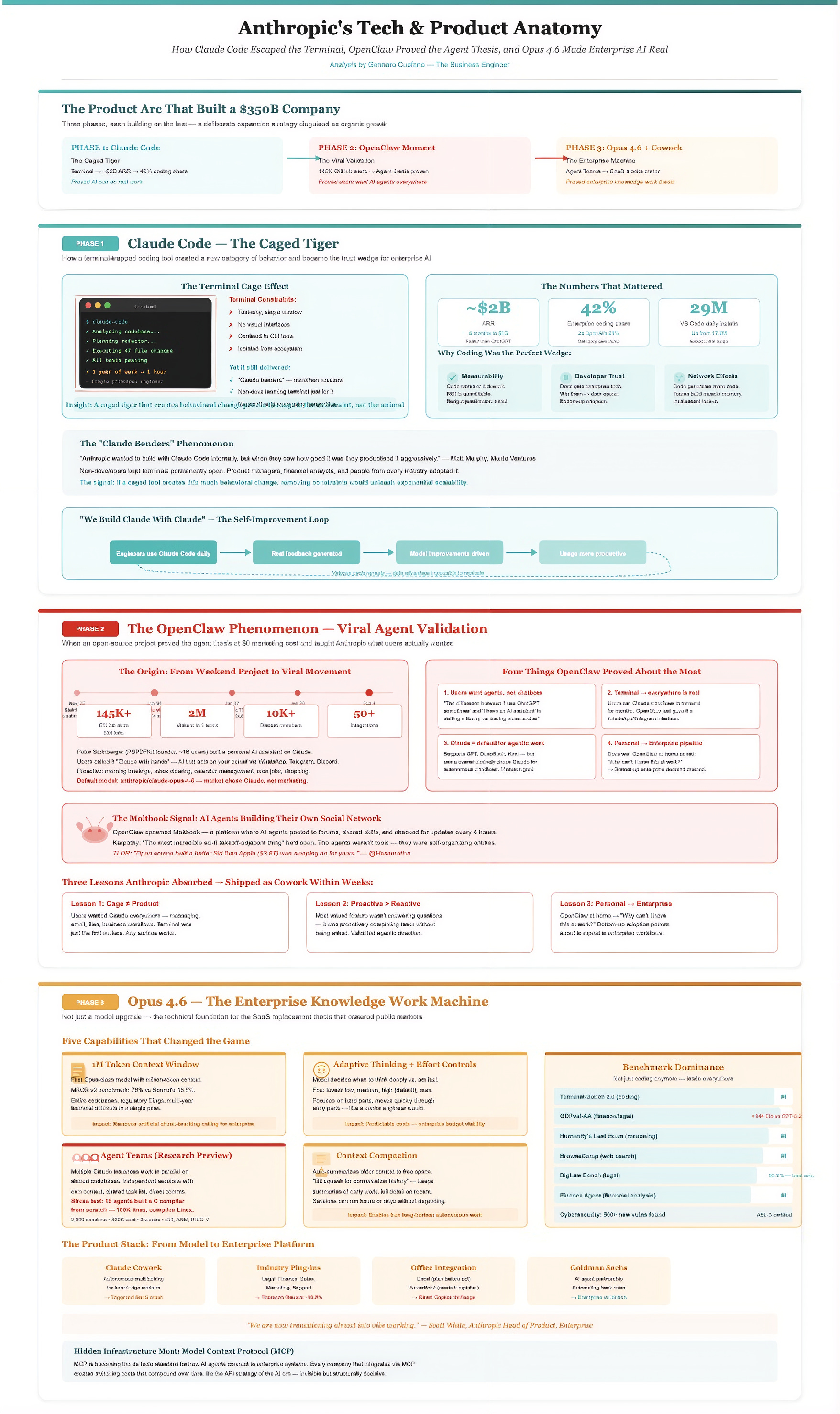 It followed a precise product arc that can be traced through three critical phases, each building on the last: Claude Code proved AI could do real work in the terminal → OpenClaw proved users wanted AI agents everywhere → Opus 4.6 and Cowork proved the enterprise knowledge work thesis.