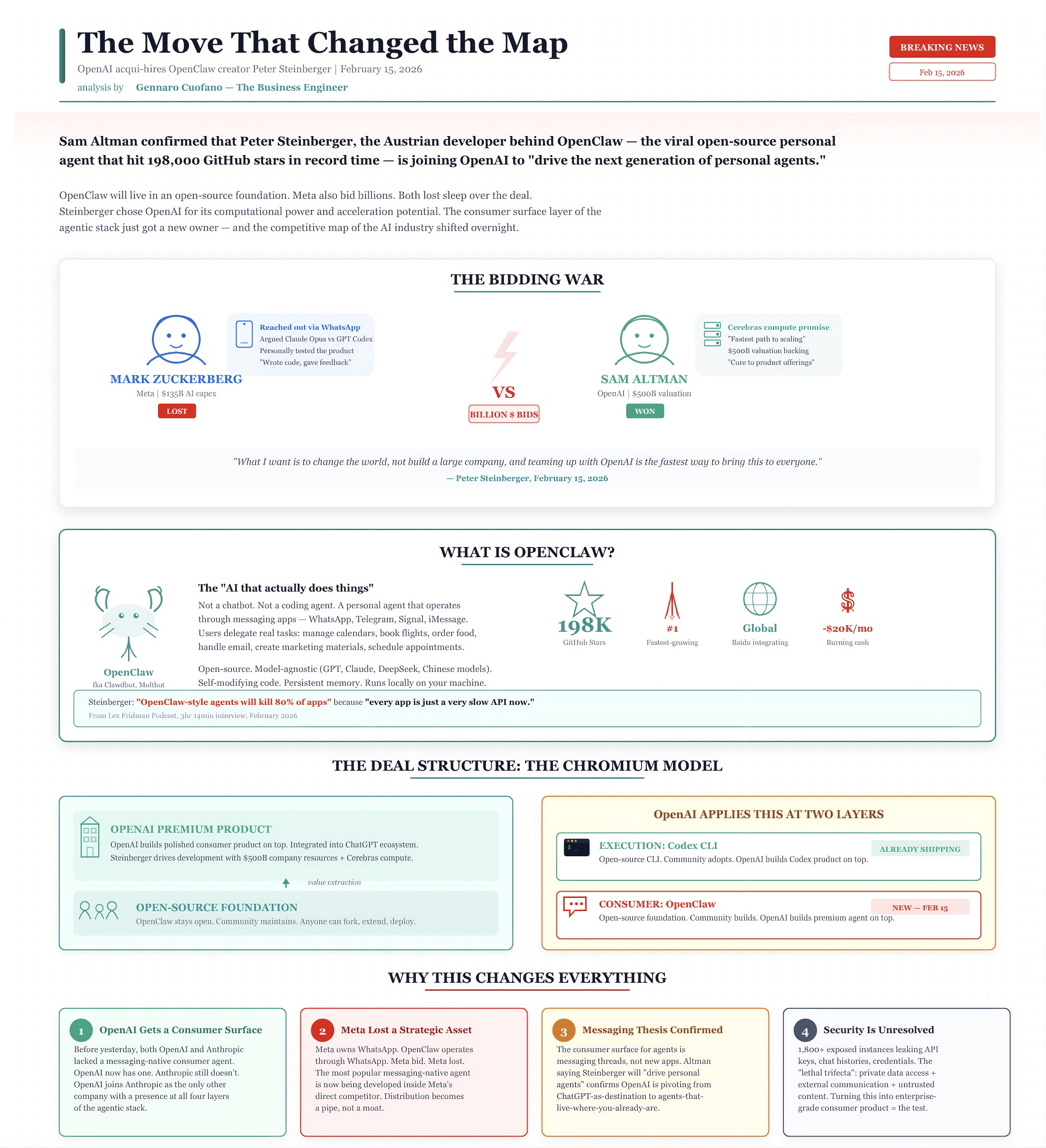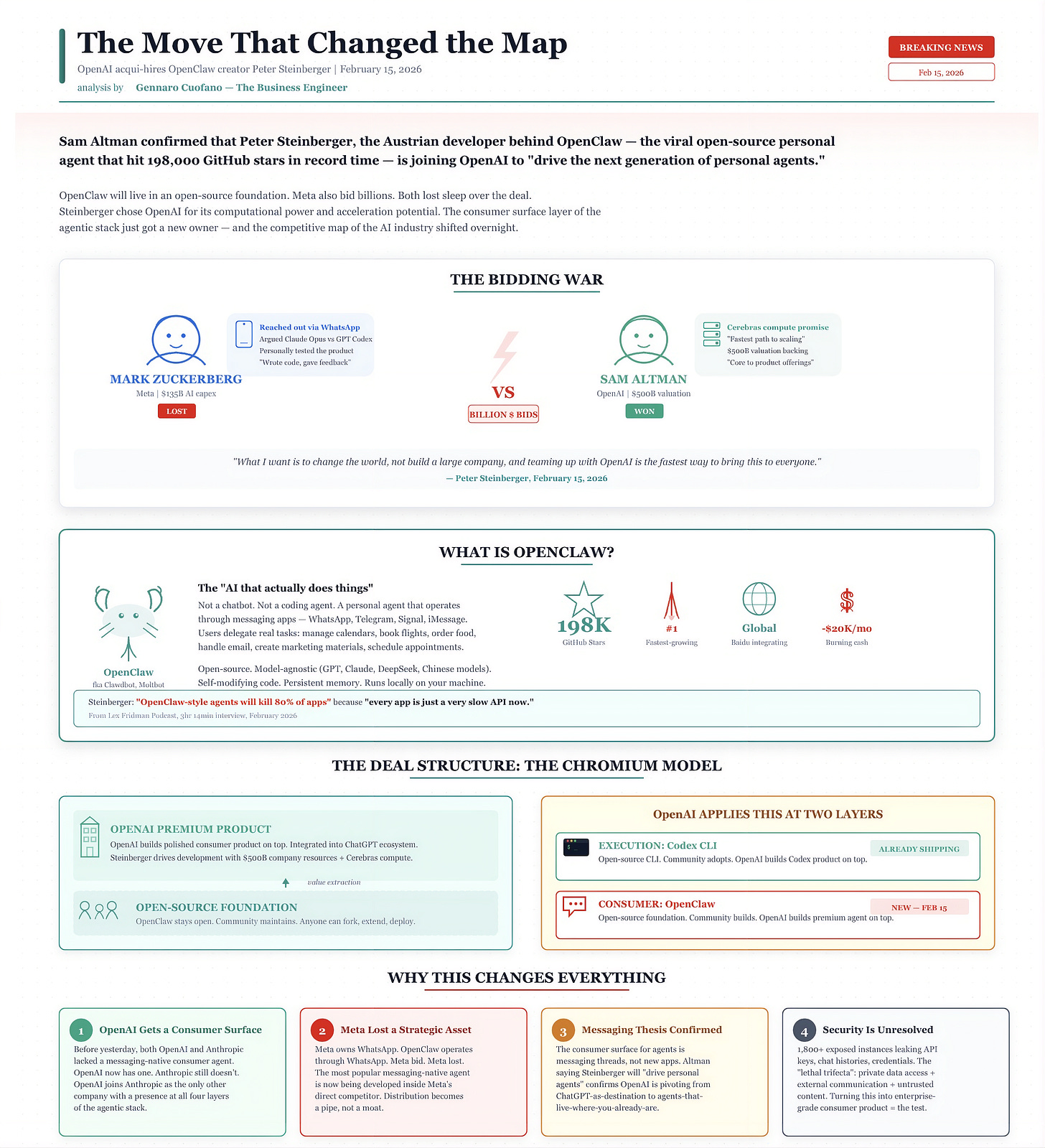 On February 15, 2026, OpenAI confirmed the acqui-hire of Peter Steinberger, the Austrian developer behind OpenClaw, the viral open-source personal agent that hit 198,000 GitHub stars in record time.