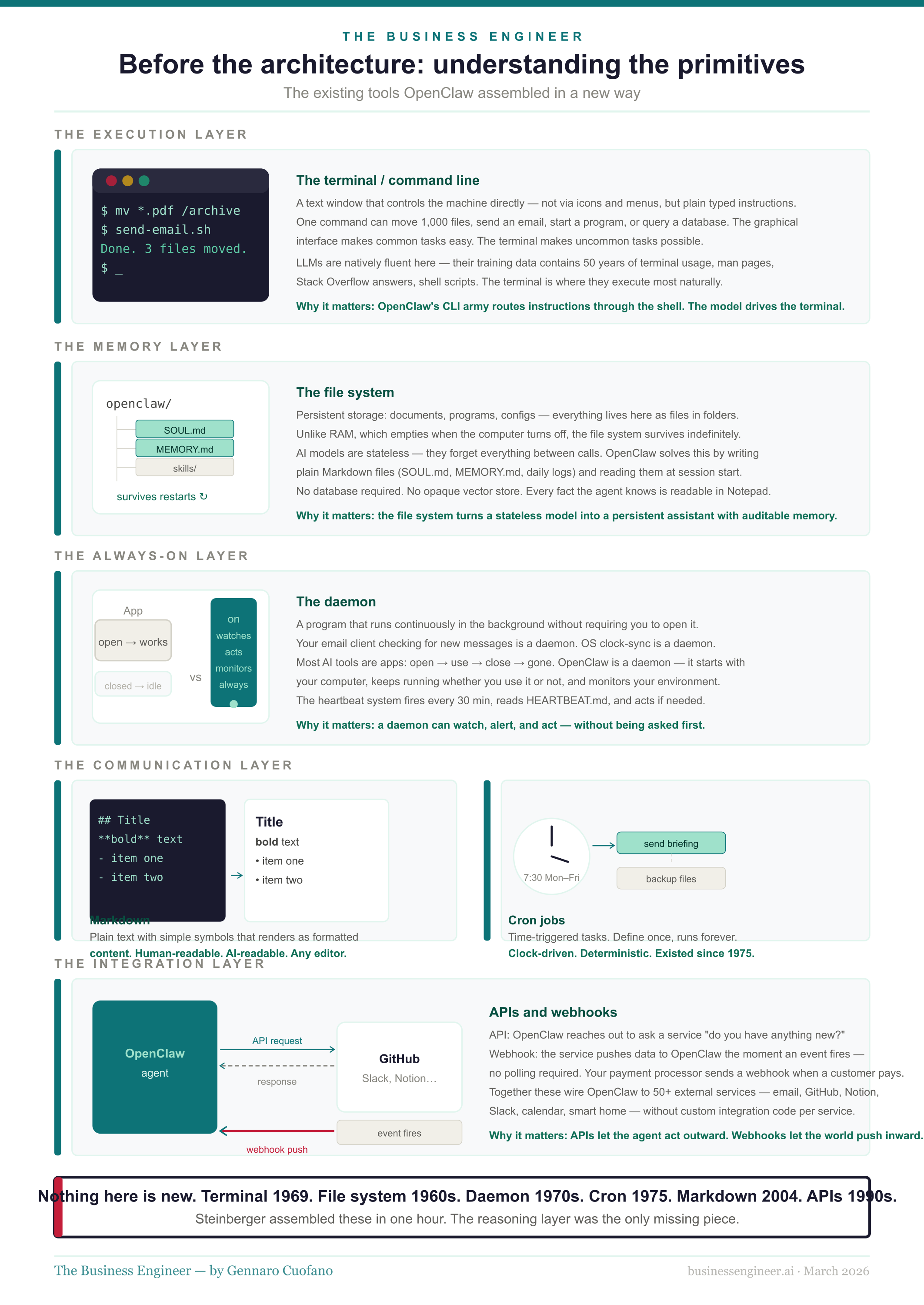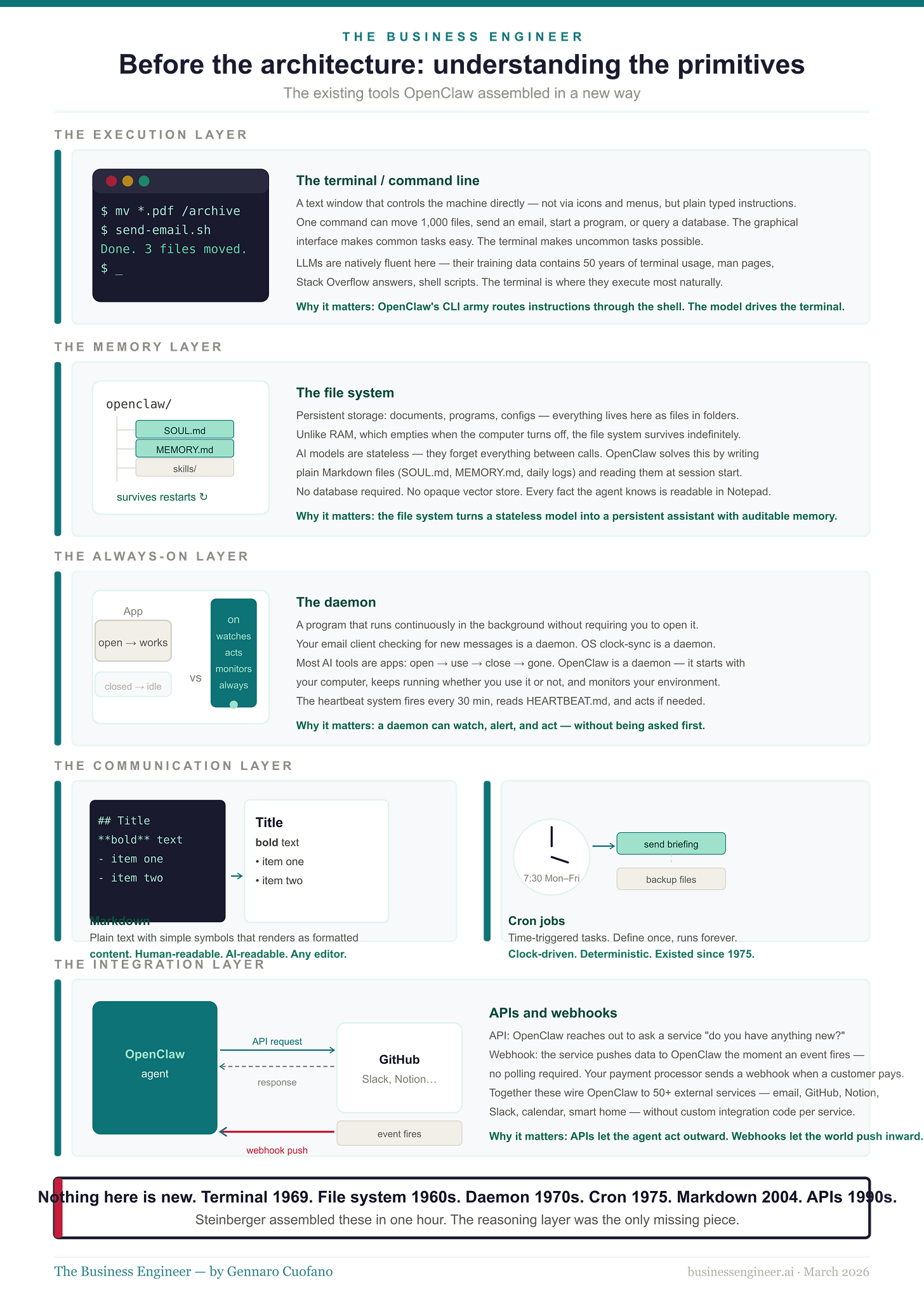 Before explaining how OpenClaw works, it is worth explaining the underlying building blocks it uses — the tools that have existed for decades and that OpenClaw assembled in a new way. For a software engineer, these are obvious. For a business leader, they are worth a minute.