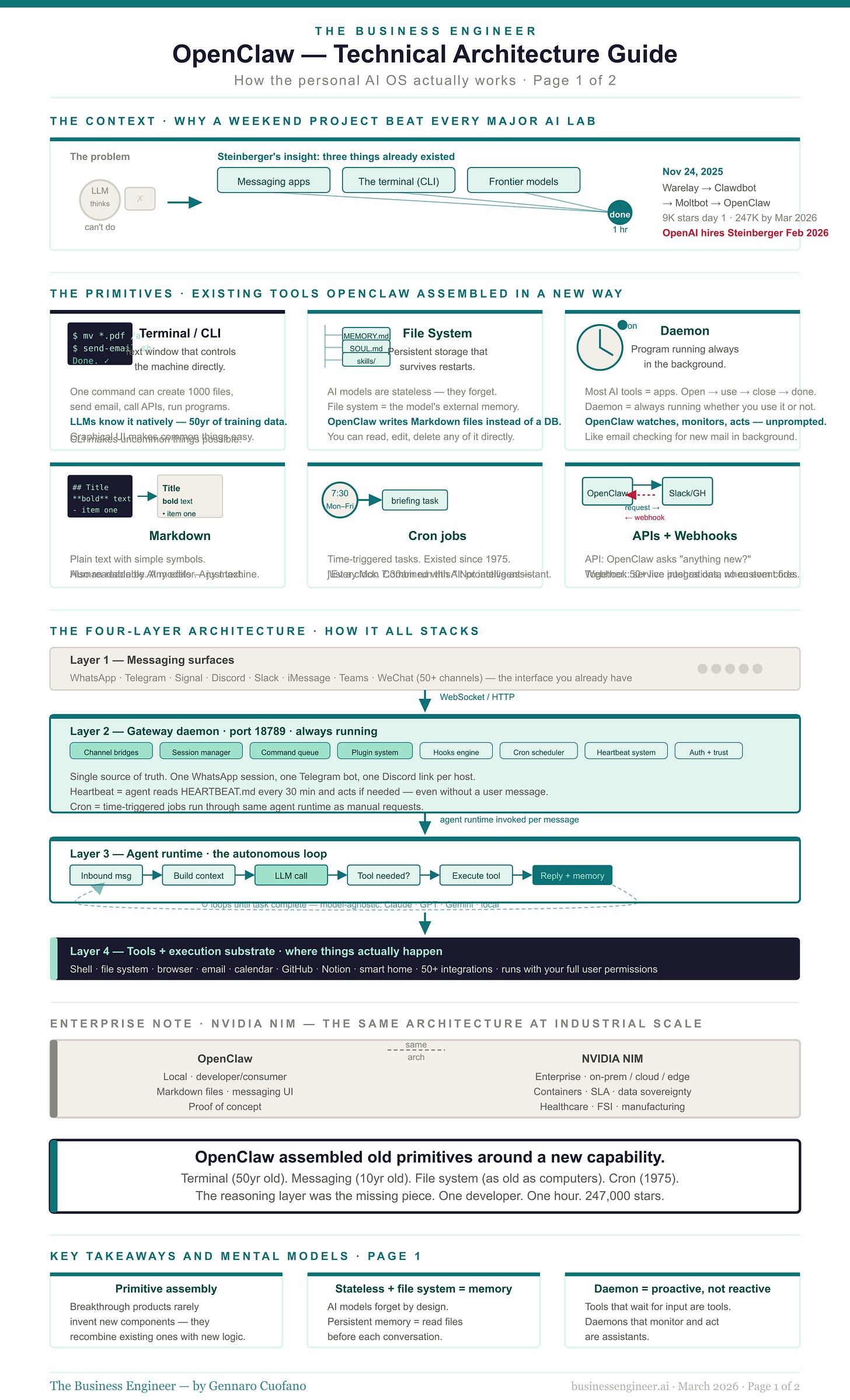 Peter Steinberger, an Austrian developer who had previously built and sold PSPDFKit (now Nutrient), a PDF software company, saw the combination. In November 2025, he spent roughly one hour connecting these three things: a messaging app, a frontier model, and a terminal. The result was the first version of what would eventually become OpenClaw.