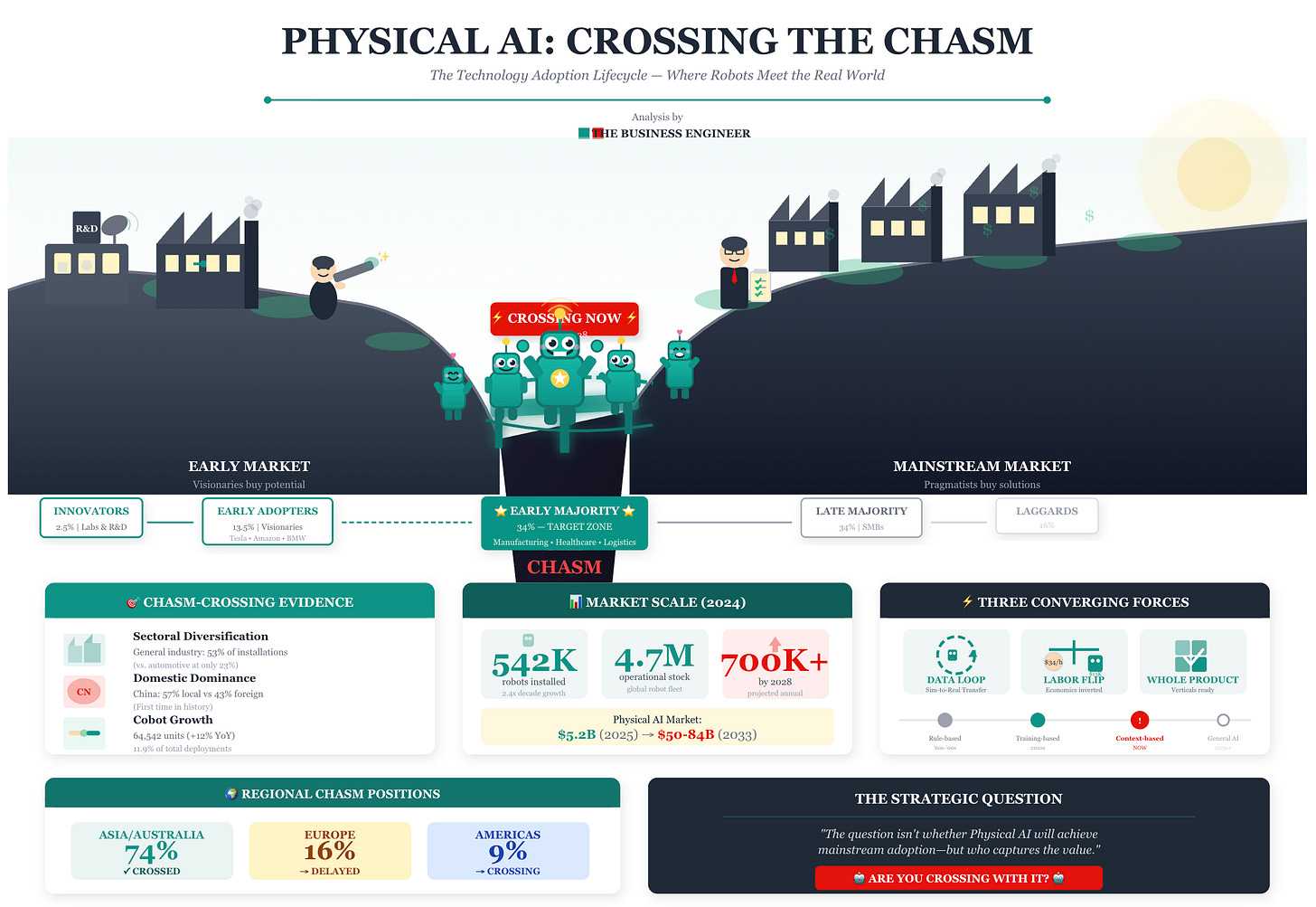 Physical AI, the convergence of artificial intelligence with robots that perceive, decide, and act in the real world, has reached the critical inflection point Geoffrey Moore identified as “crossing the chasm.”