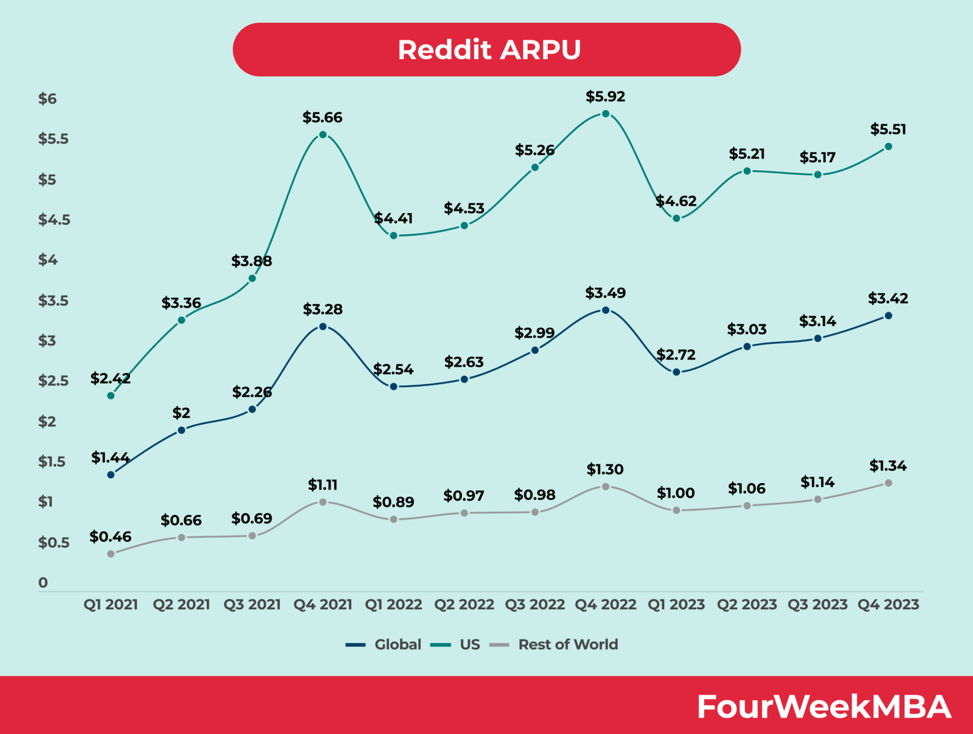 By Q4 2023, Reddit reported $3.42 ARPU globally, $5.51 in the US, and $1.34 in the Rest of the World.