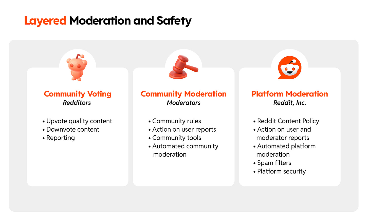Community Moderation: Each subreddit has its own set of rules created and enforced by volunteer moderators, allowing communities to maintain their culture and values. Moderators have the authority to remove content that violates community rules without Reddit's intervention.