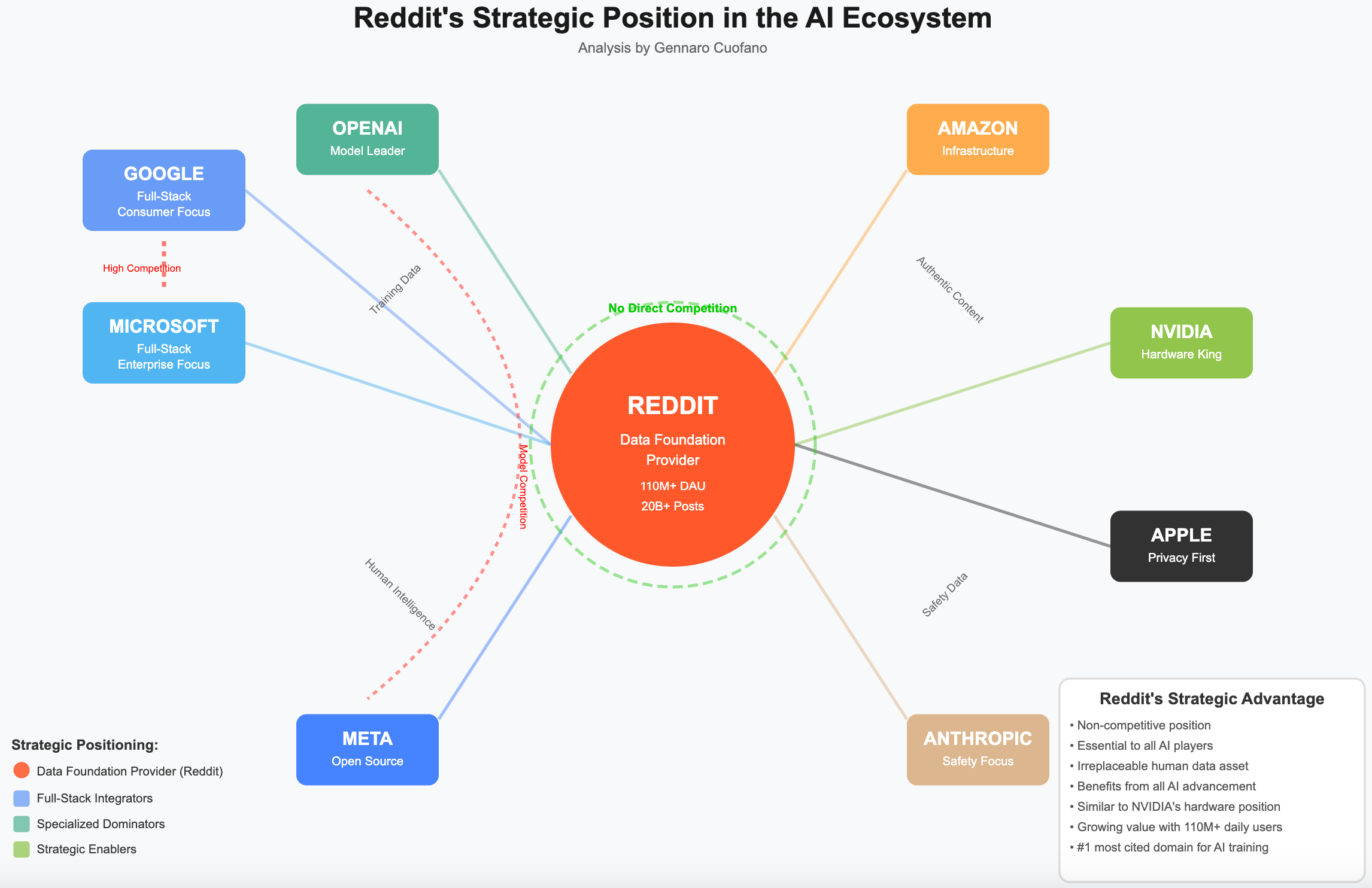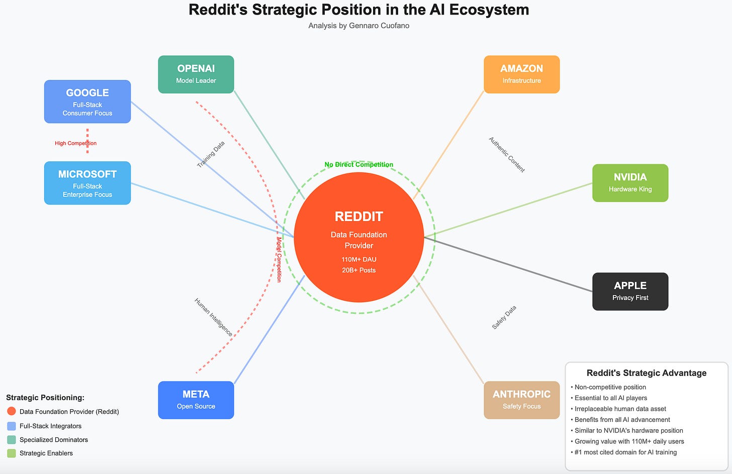 Reddit emerges as a unique player that has carved out a unique position in the AI value chain—one that places it outside traditional competitive dynamics while making it essential to every major AI player's success.