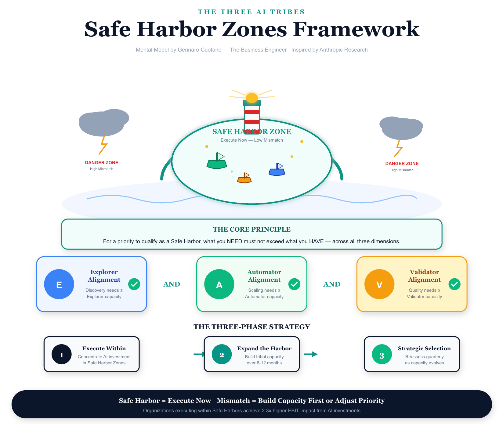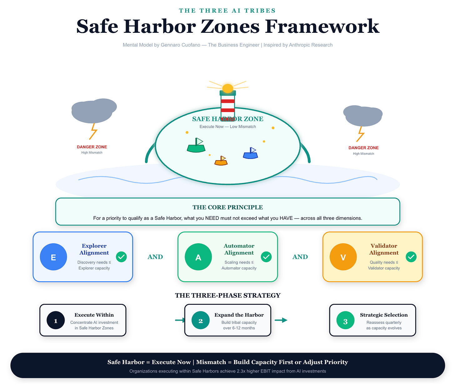 Safe Harbor Zones represent the strategic sweet spot where organizational tribal capacity naturally aligns with strategic priorities. Within these zones, AI initiatives execute with dramatically higher success rates—not because the technology is better, but because the human organization is configured to succeed.