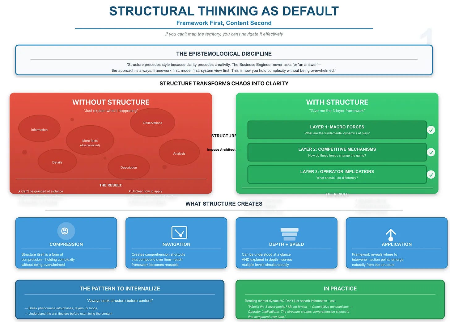 The Business Engineer doesn’t just use structural thinking for specific tasks—it’s the default cognitive mode. Every observation triggers pattern recognition. Every data point connects to frameworks. Every question maps to the underlying architecture. This isn’t a technique you apply; it’s how you see.