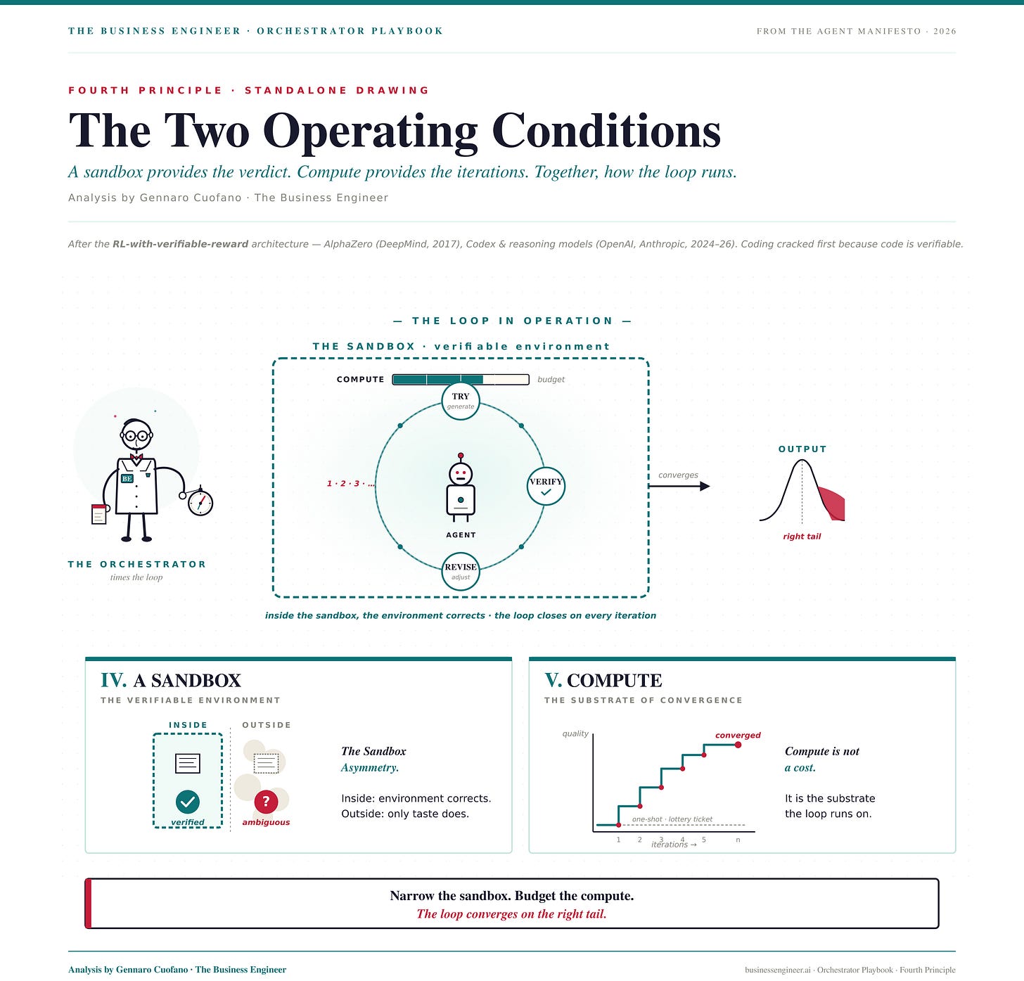 Taste is the only instrument that survives the sandbox boundary. Inside the sandbox — inside code, mathematics, anywhere with verifiable ground truth — the environment provides the correction signal. Outside the sandbox, the correction signal is the orchestrator’s taste. There is no substitute. No prompt technique. No framework. No amount of compute.