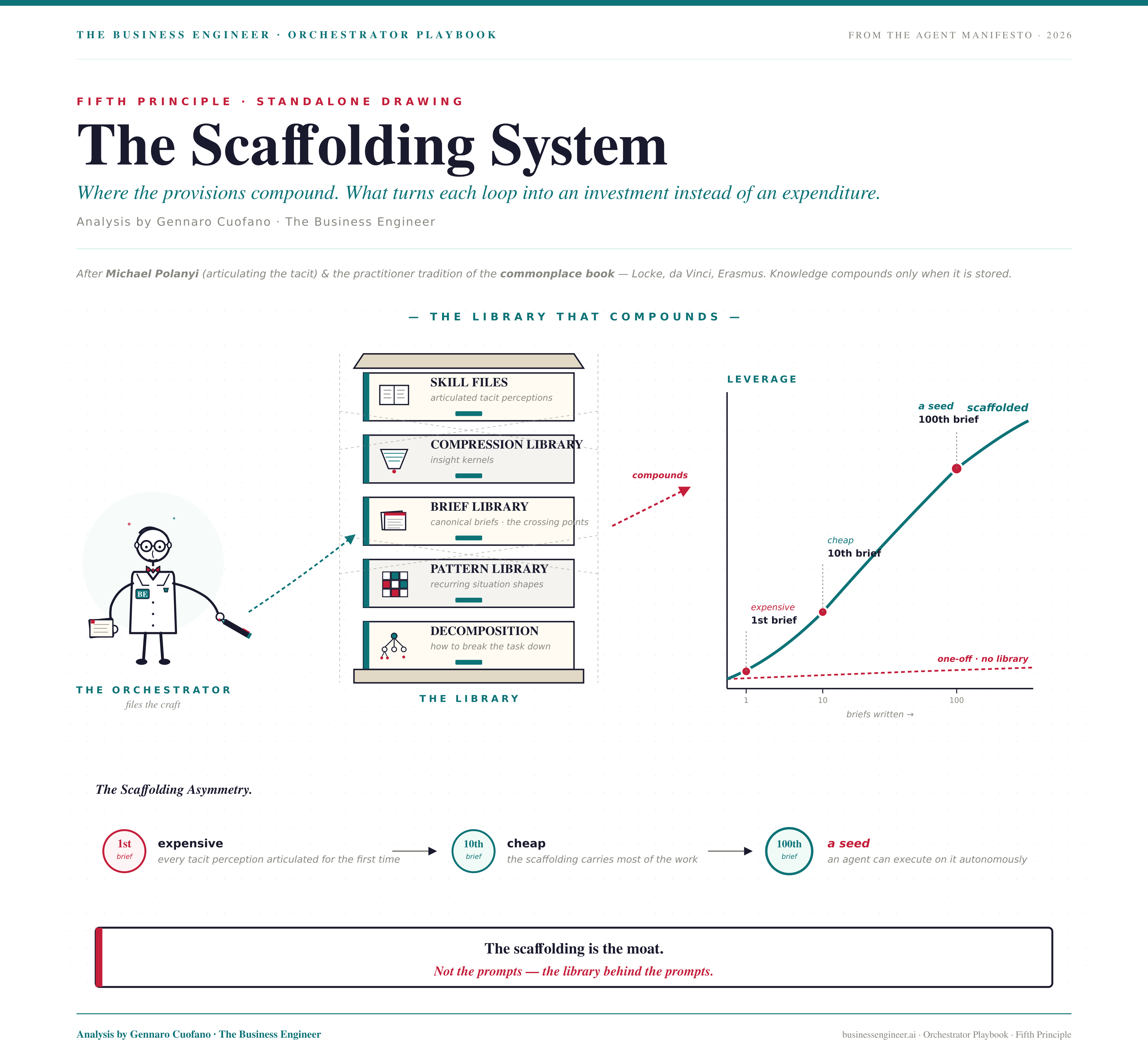 The Scaffolding Asymmetry: the first brief you write for a domain is expensive. The tenth is cheap. The hundredth is a seed the agent can execute on. The instruments, stored as scaffolding, become a persistent conditioning surface. They turn each agentic loop into a compounding investment rather than a one-off expenditure.