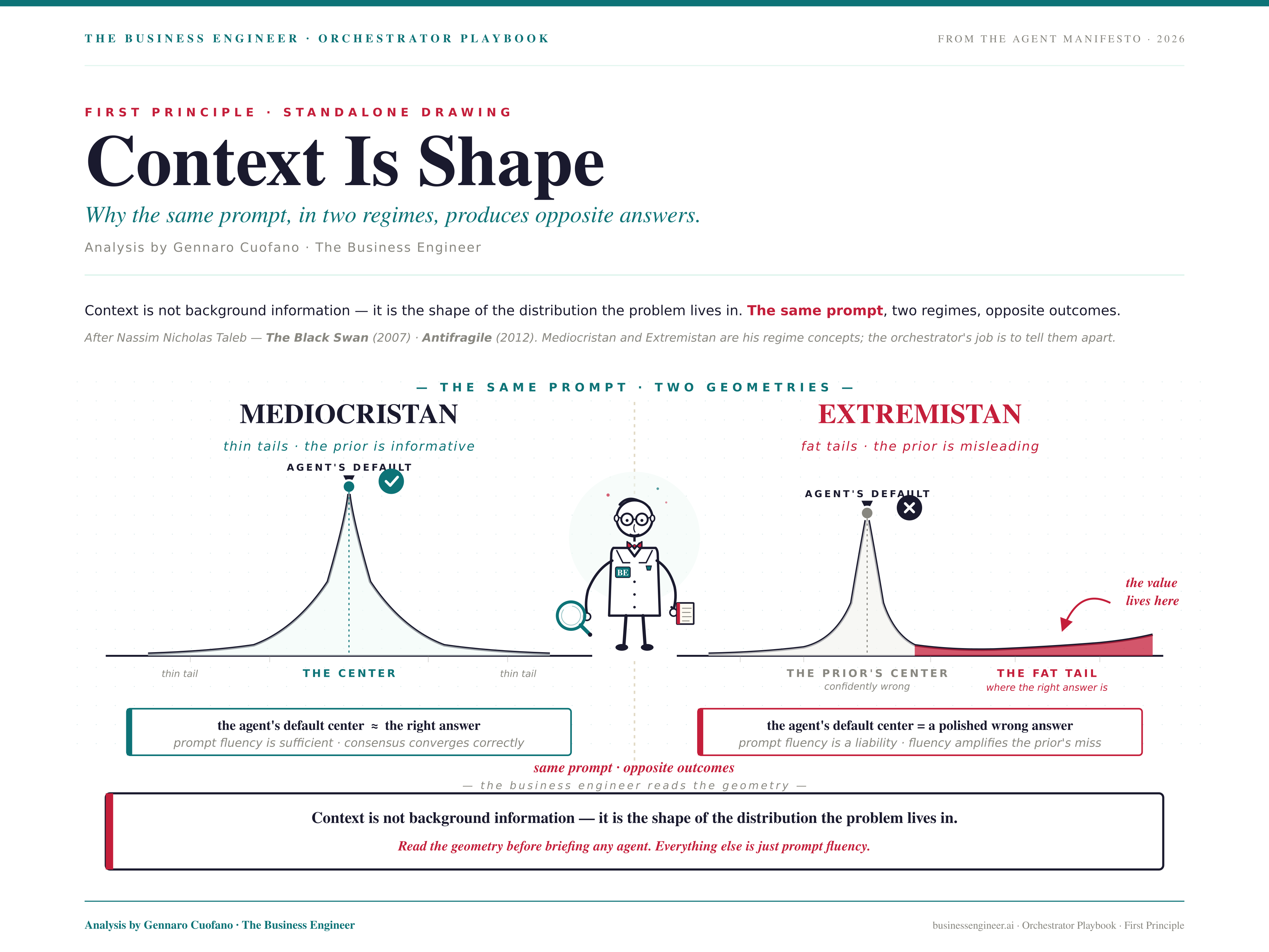 In Mediocristan, the agent’s center-of-distribution default is correct. Prompt fluency is sufficient. The loop converges on the right answer because the right answer is the center.