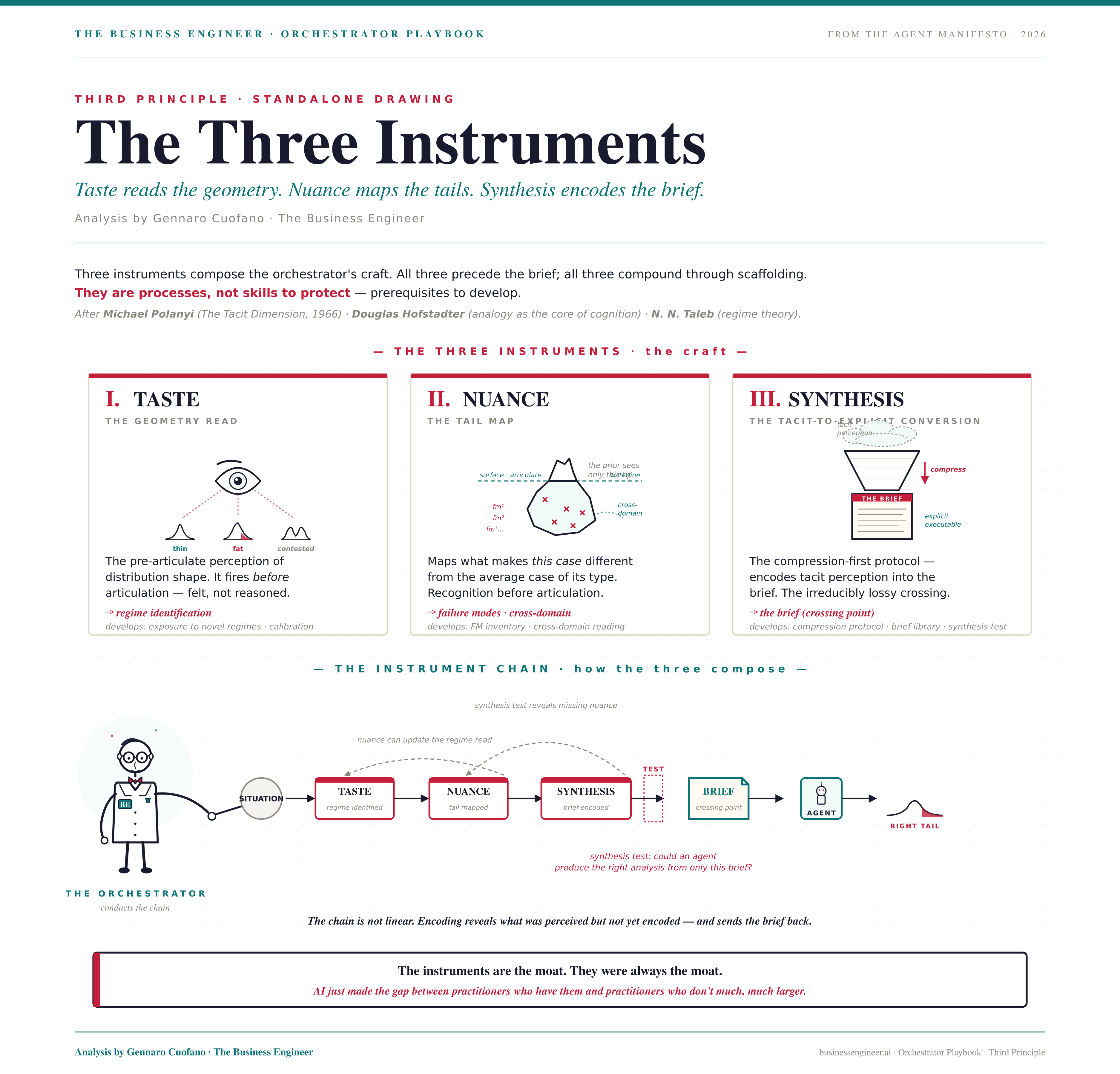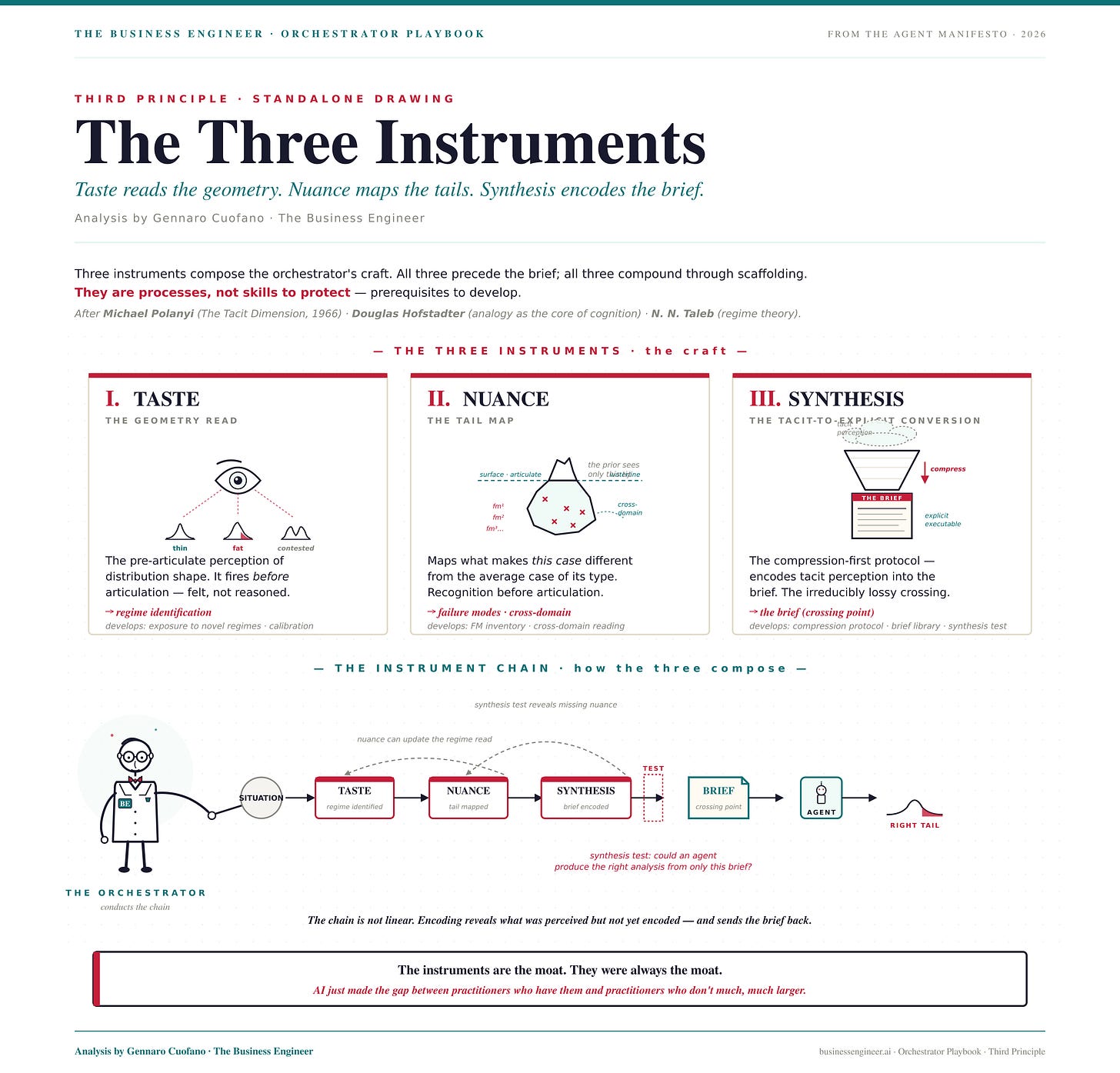These three instruments compose the chain. Taste identifies the regime. Nuance maps the tail structure. Synthesis encodes both into the brief. The synthesis test — could an agent produce the right analysis from only this brief? — is the gate. The brief is the crossing point from tacit perception to executable instruction.
