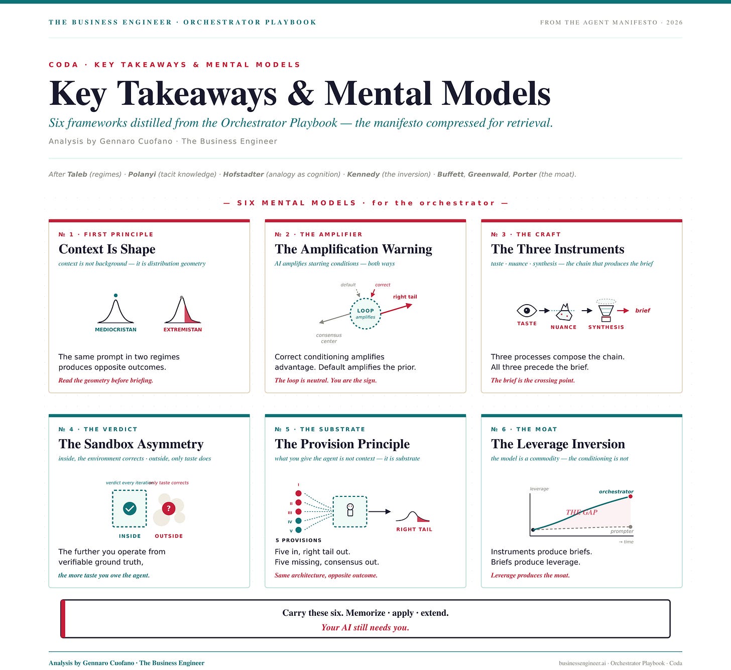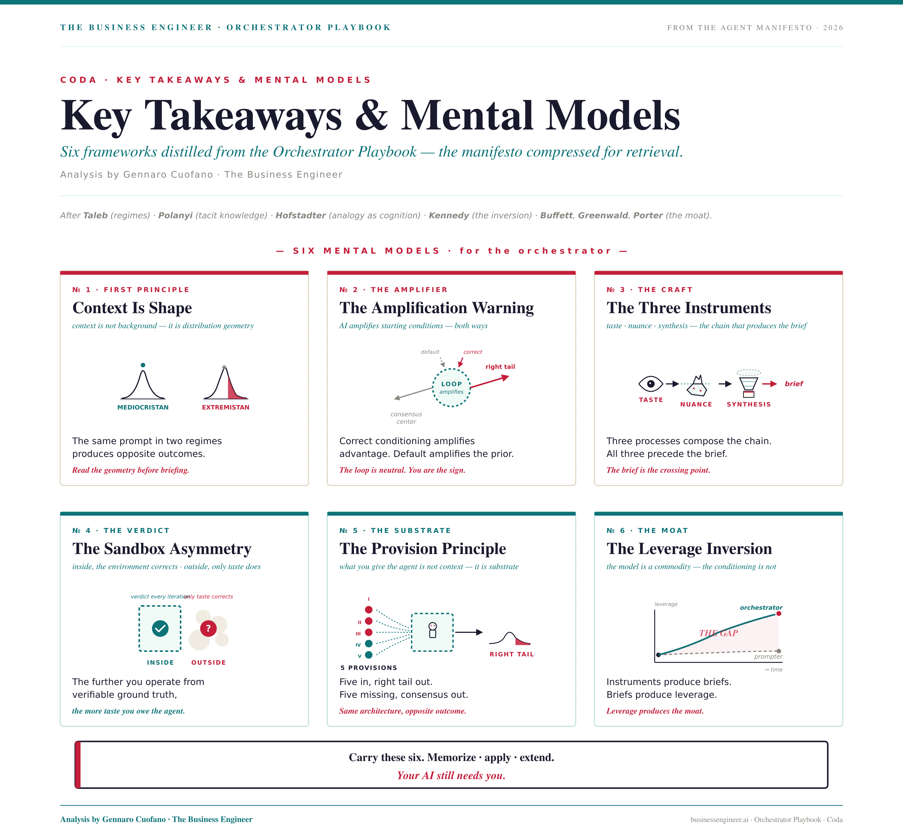 The practitioners who compound in the agentic era are not the ones who prompt most fluently. They are the ones who read distributions most accurately. The instruments produce the briefs. The briefs produce the leverage. The leverage produces the moat.