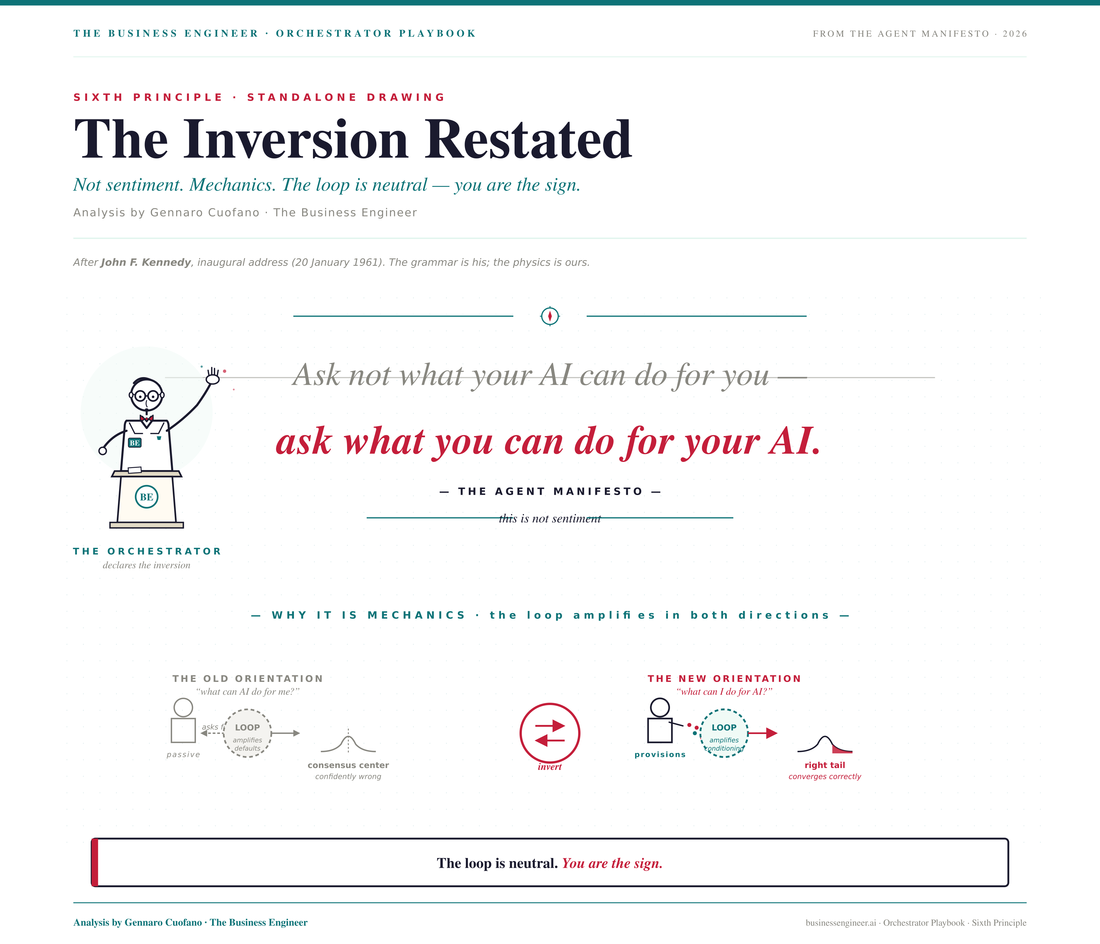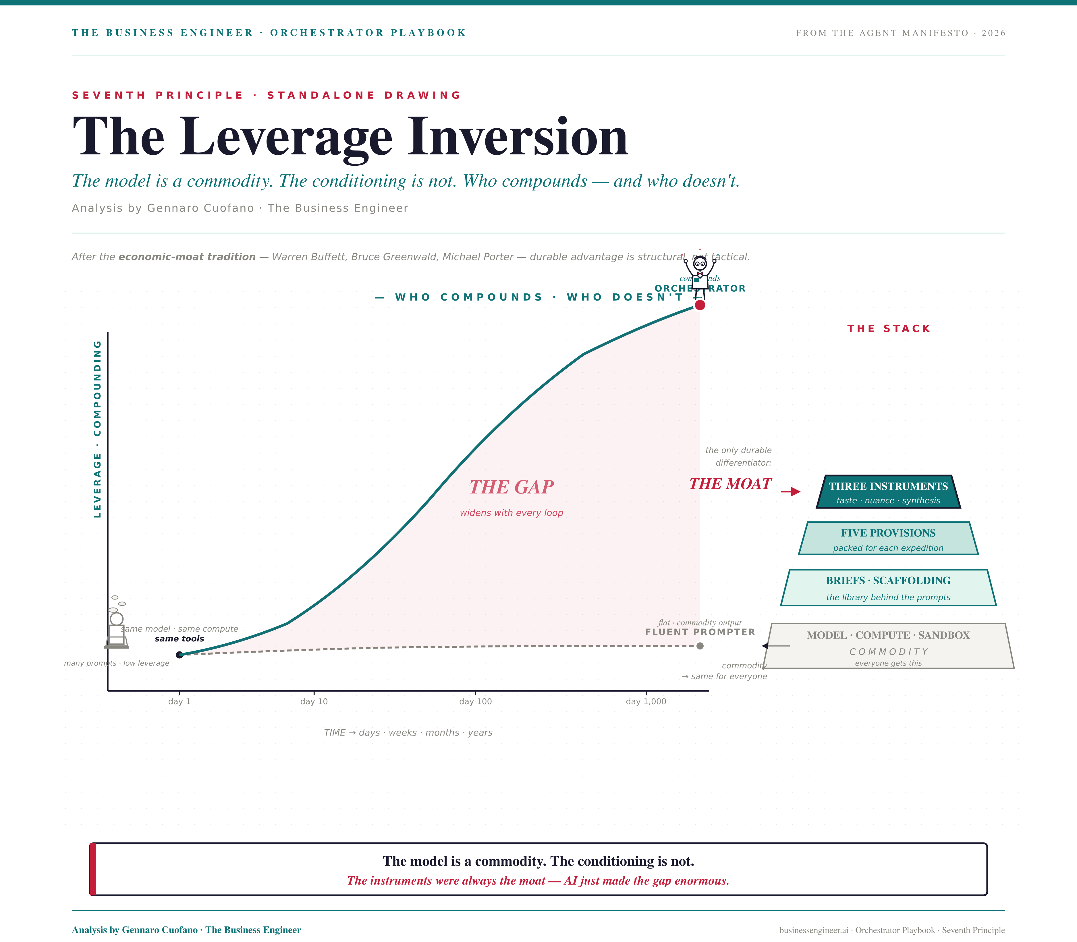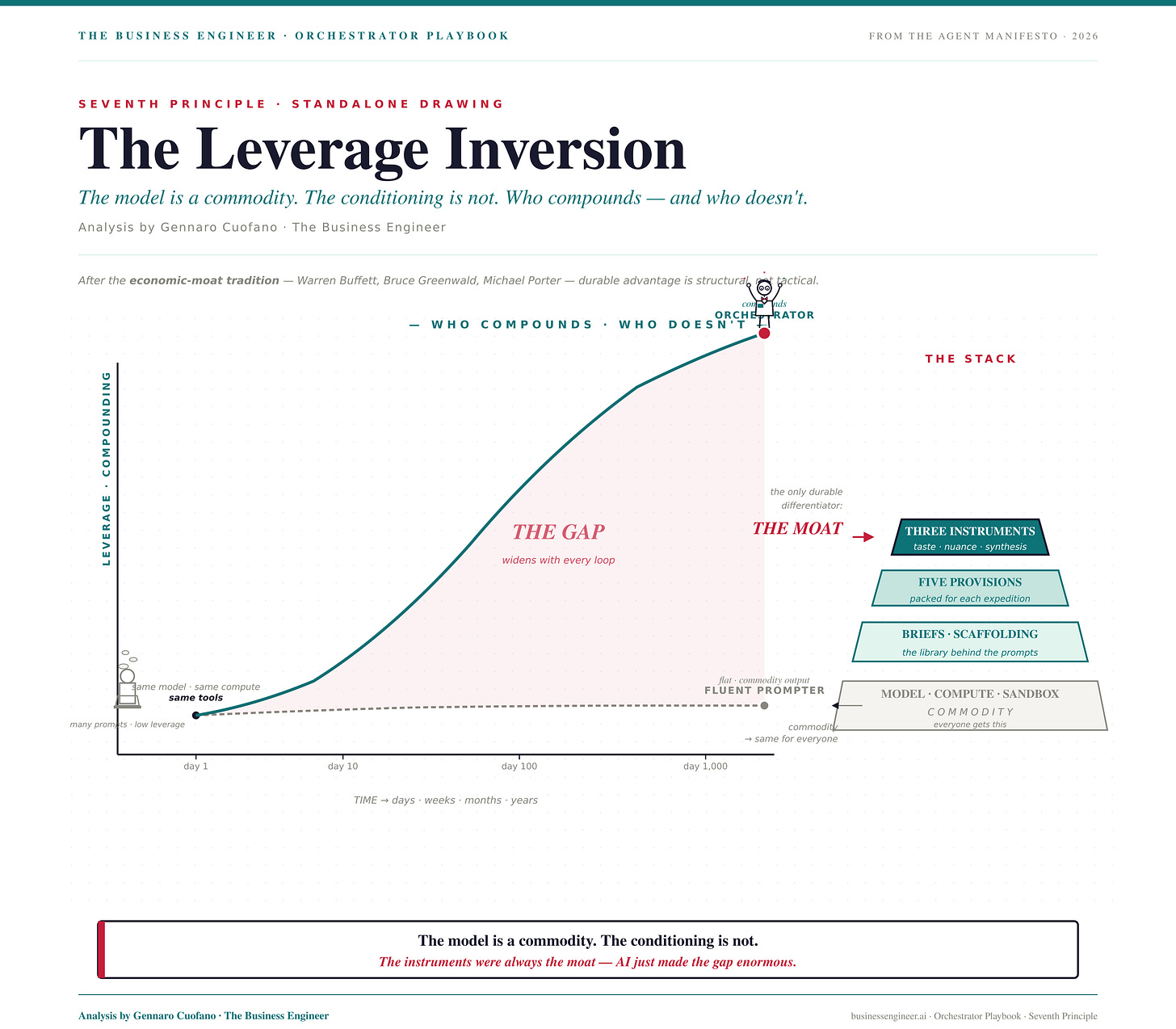 The Leverage Inversion — The practitioners who compound in the agentic era are the ones who read distributions accurately, not the ones who prompt most fluently. The instruments produce the briefs. The briefs produce the leverage. The leverage produces the moat.