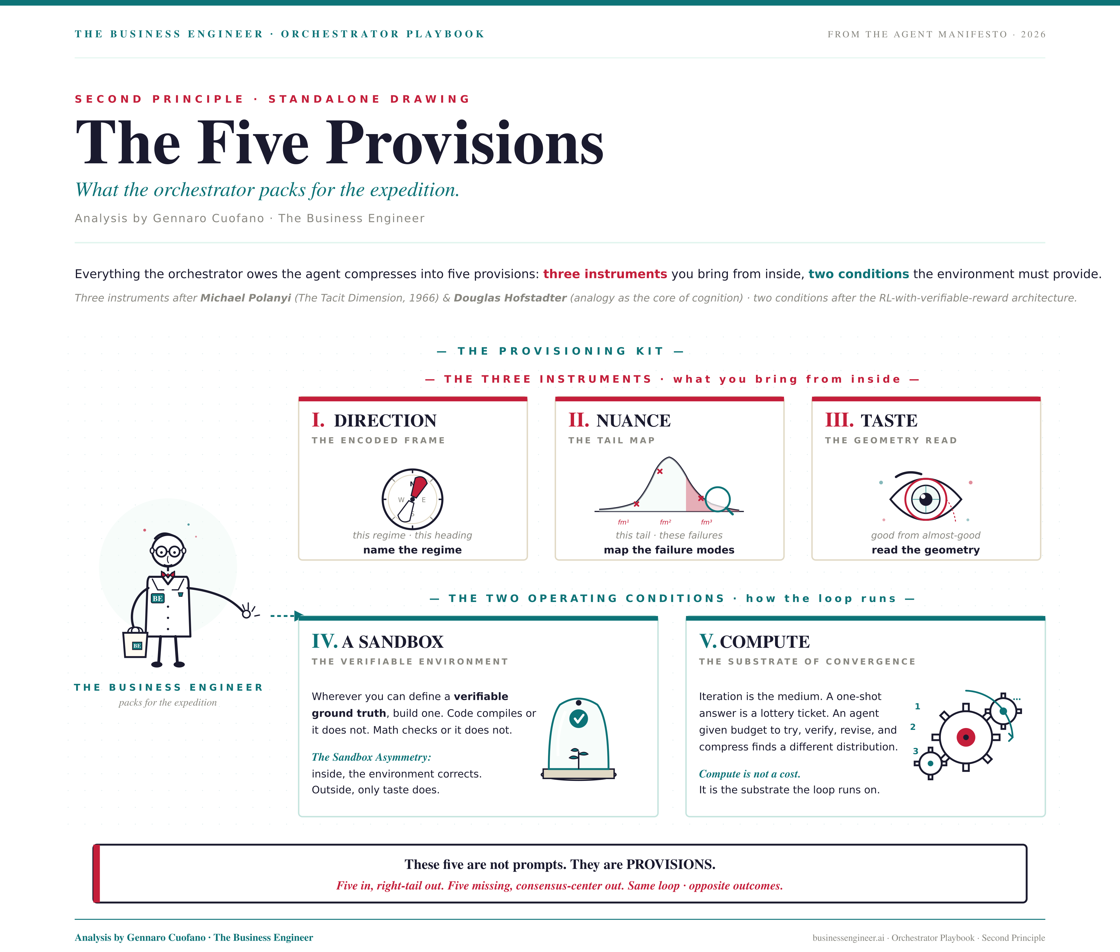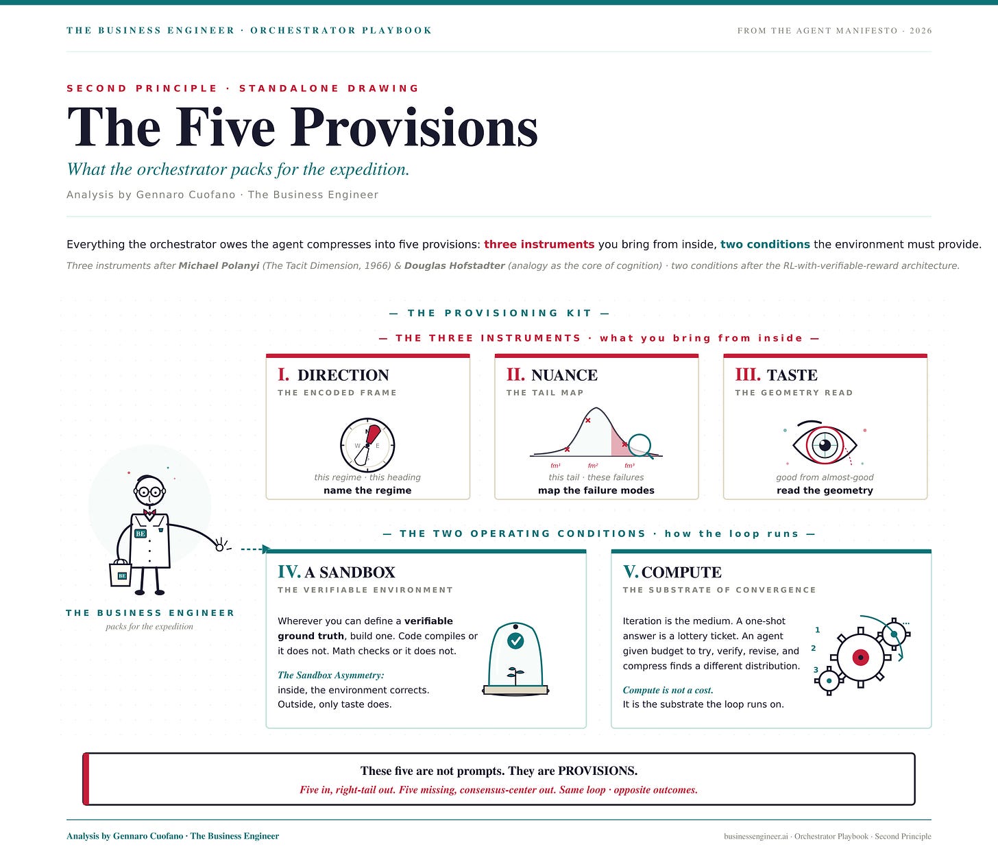 The Provision Principle — What you give the agent is not context; it is substrate for compounding. Five provisions packed, right tail converges. Five provisions missing, consensus center converges. Same architecture, opposite outcome.