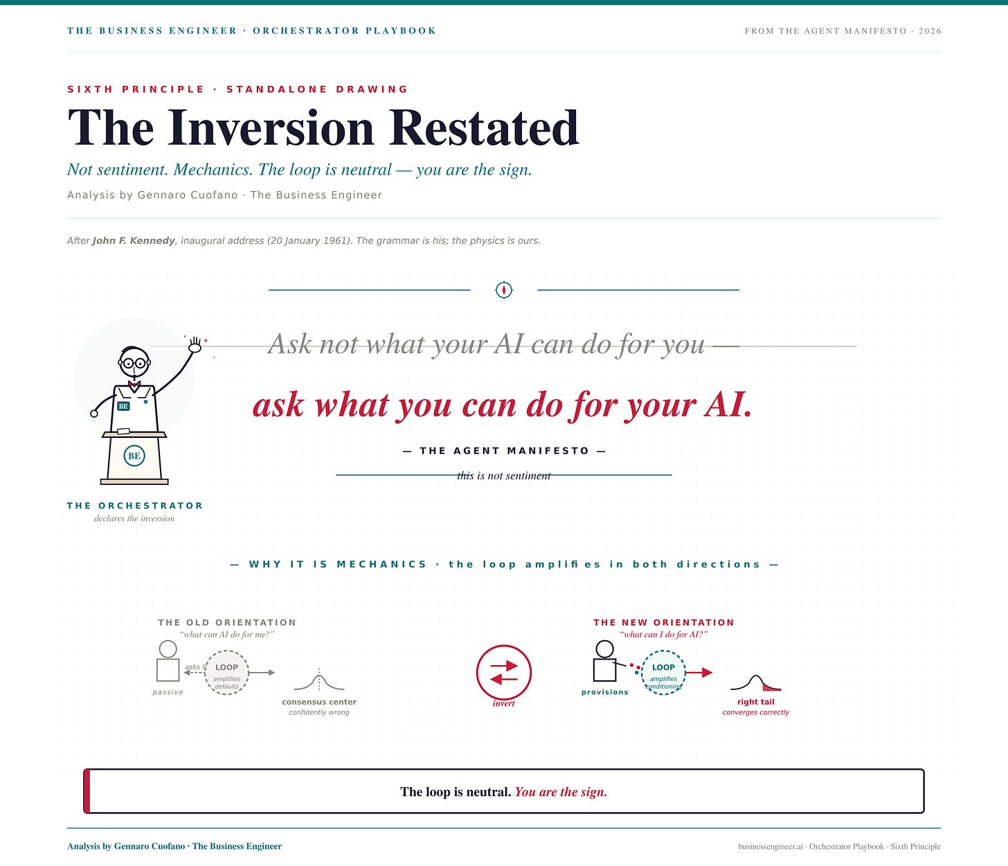 That single sentence is the inversion at the heart of this moment. For three years, we asked what AI could do for us — answer, draft, code, summarize, solve. We benchmarked weights and measured outputs. We treated the model as a vending machine and the prompt as a coin. We forgot the architecture we were operating inside.