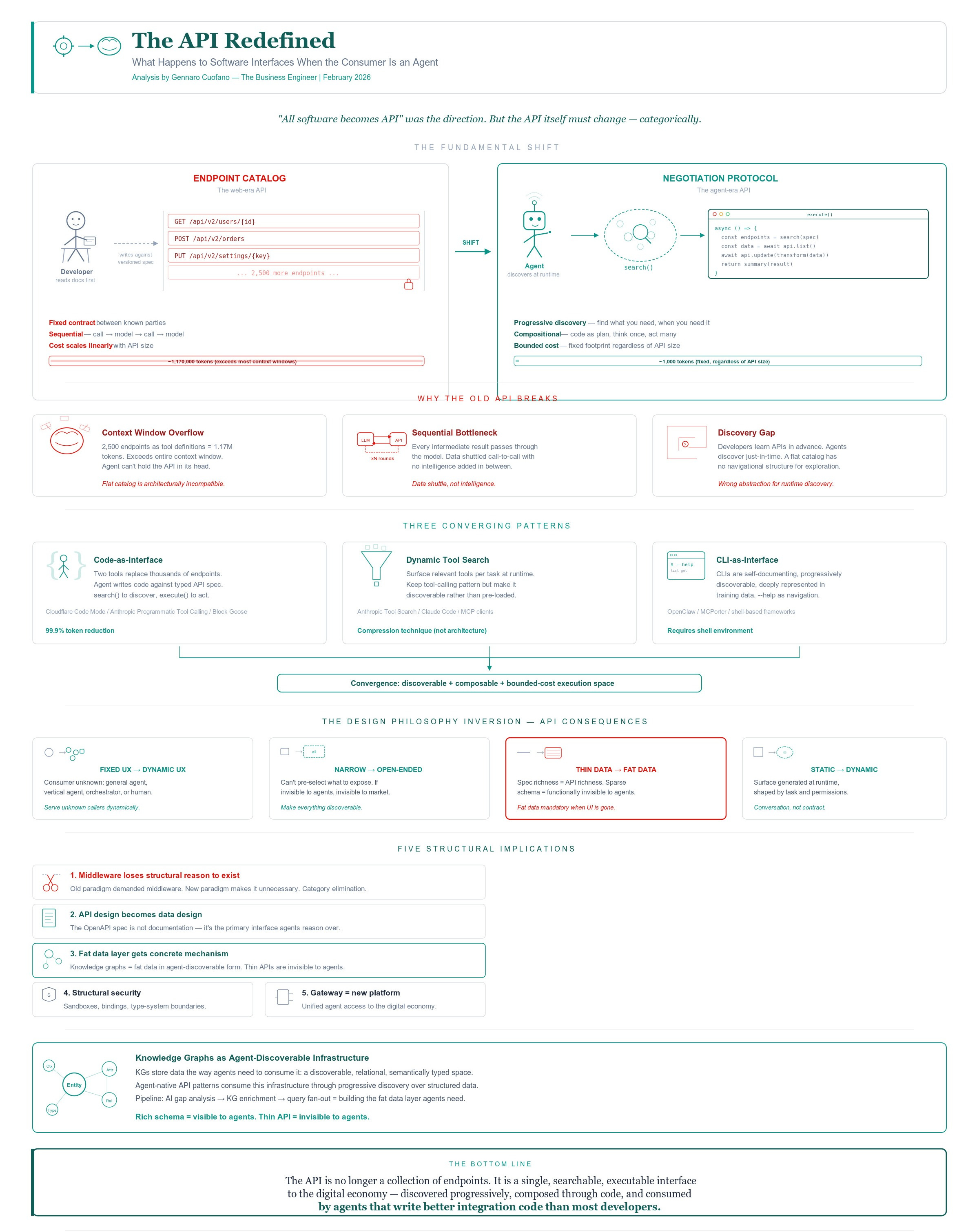 When I said “all software becomes API,” I was describing the direction in which things were heading. What I didn’t fully specify was that the API itself would have to change, not incrementally, but categorically. The concept of what an API is transforms when the primary consumer shifts from a developer who studied the documentation to an agent that discovers capabilities at runtime.