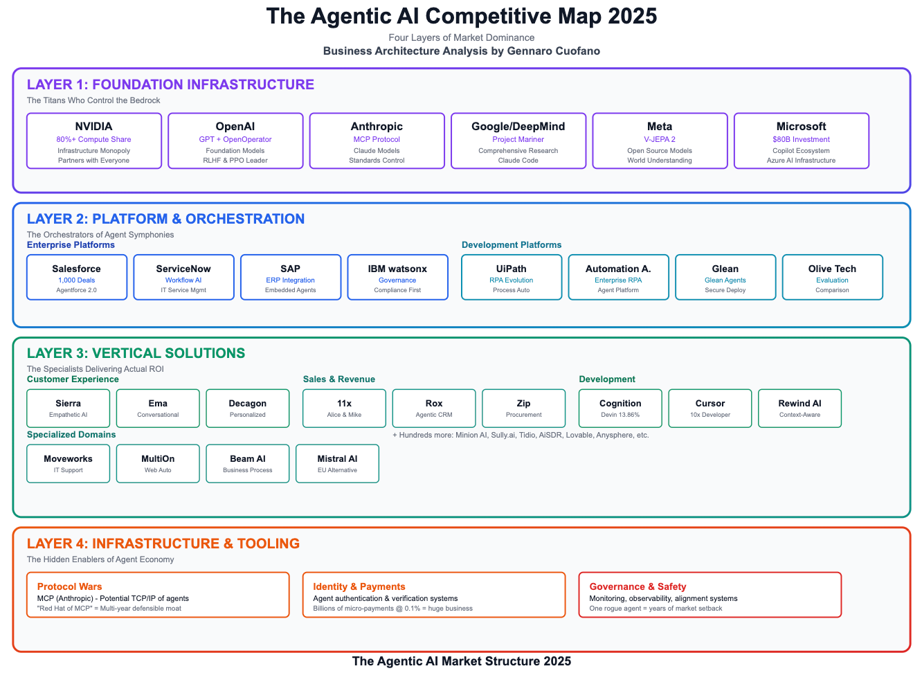 This comprehensive analysis maps the competitive landscape across four distinct layers, revealing how $100+ billion in capital is flowing through an ecosystem where 50% of enterprises will implement AI agents this year, up from just 10% currently employing them.