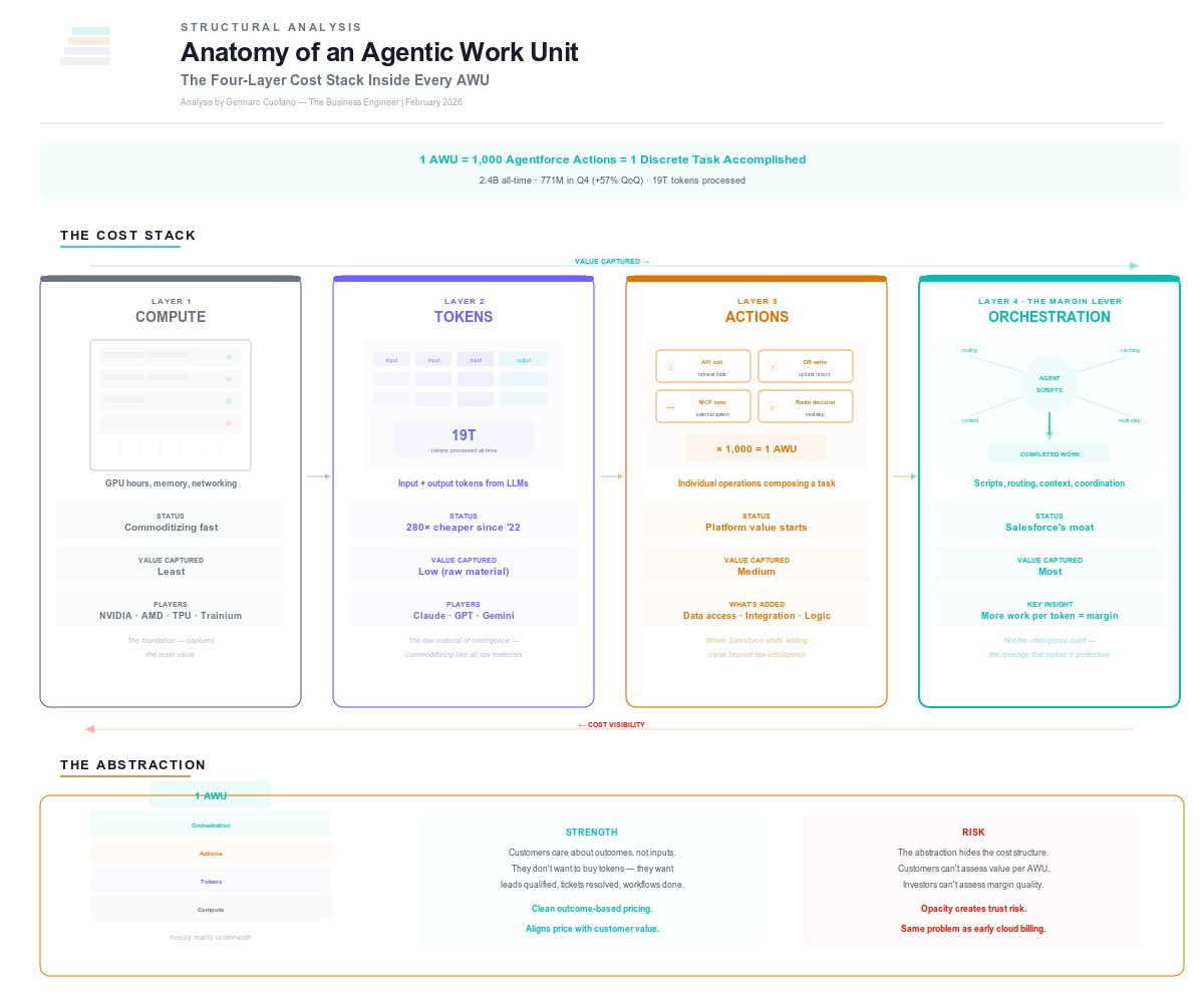 This analysis examines the AWU as a structural economic shift, not whether it works for Salesforce, but what happens when the denominator of the software industry changes from humans to work output.
