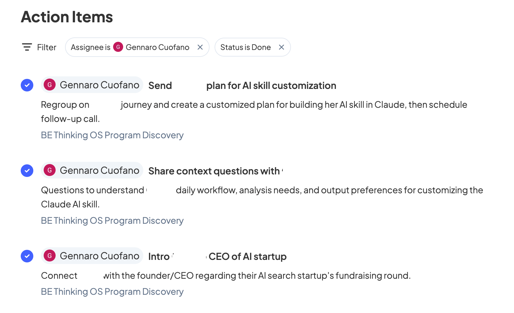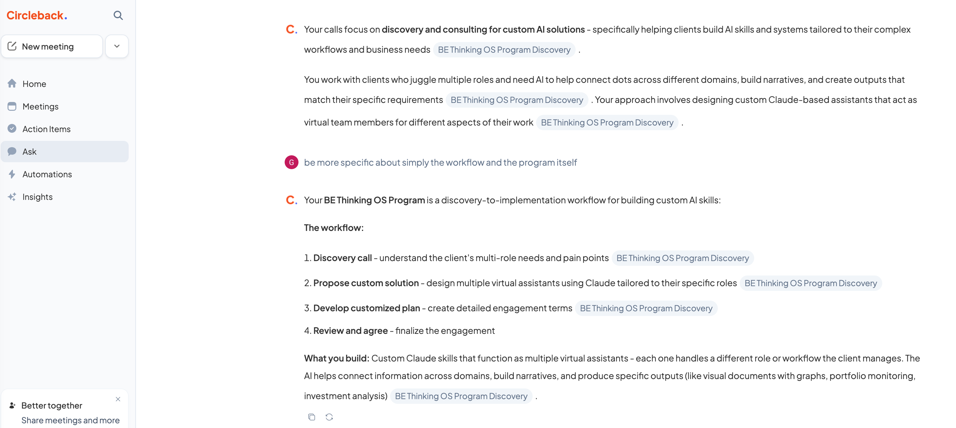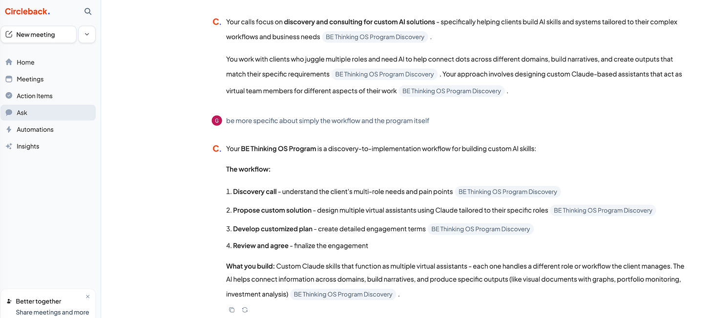 As an example of a workflow I rely on most, Circleback automatically joins my calls and then surfaces a clean action list. This single feature helps me stay organized and operate at a pace. It has become instrumental to running my solo business, functioning as an automated administrative assistant that works quietly in the background.