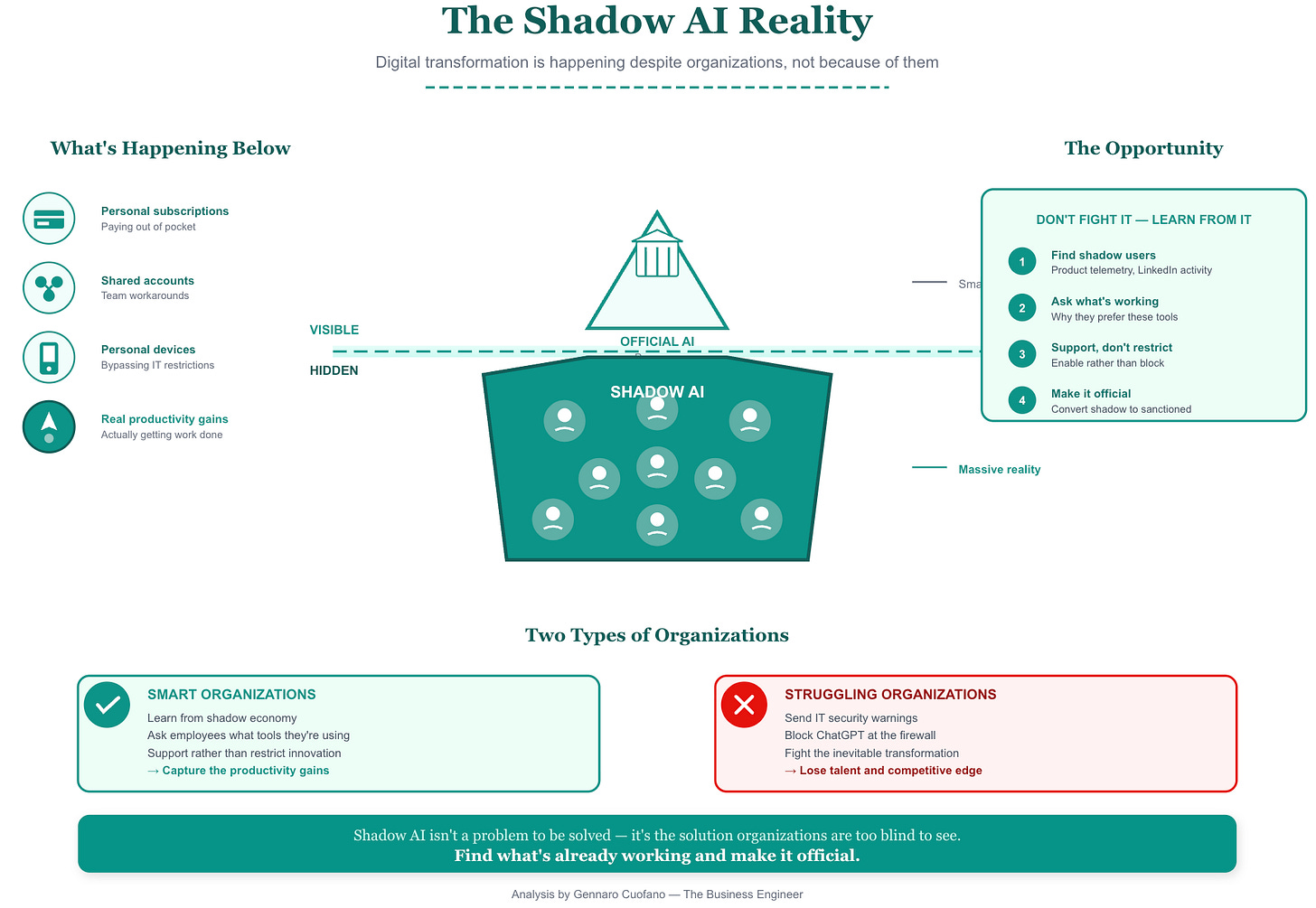 While enterprises fumble with official AI initiatives, 90% of employees are already using AI tools daily through personal subscriptions. This shadow AI economy isn’t a problem to be solved—it’s the solution that organizations are too blind to see.