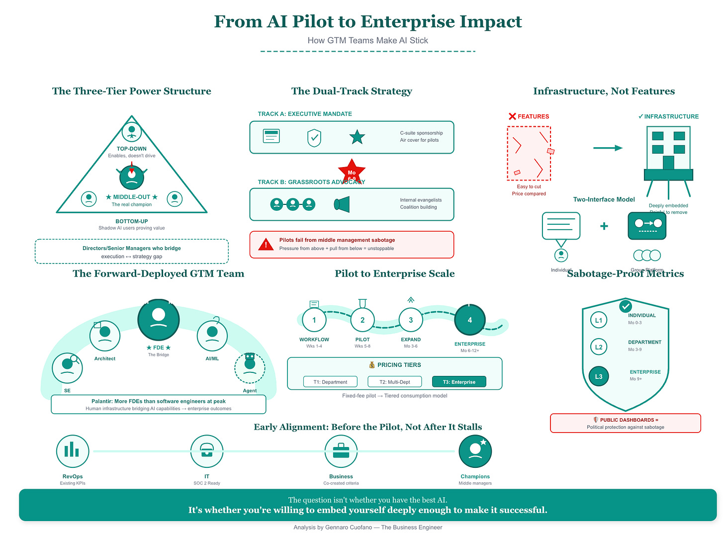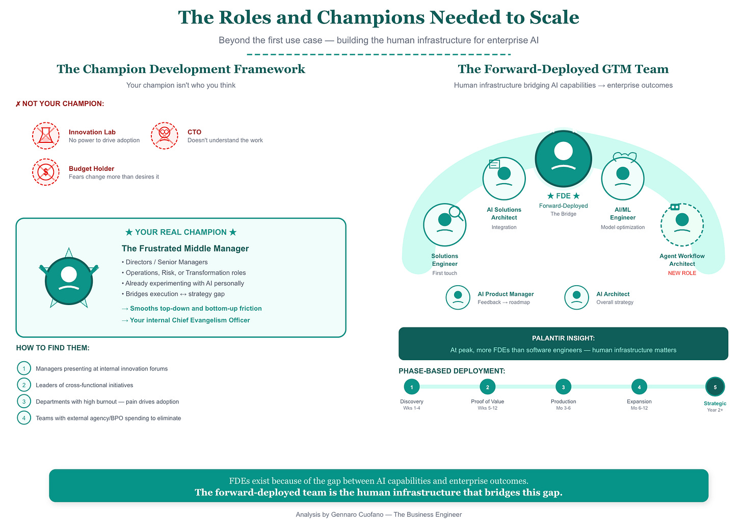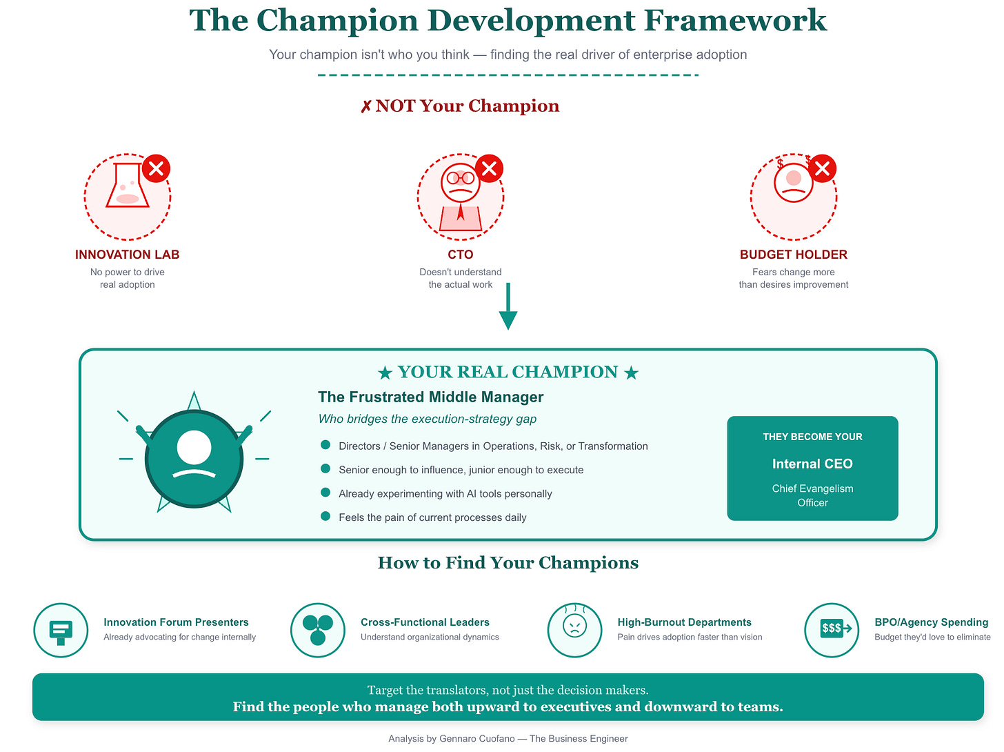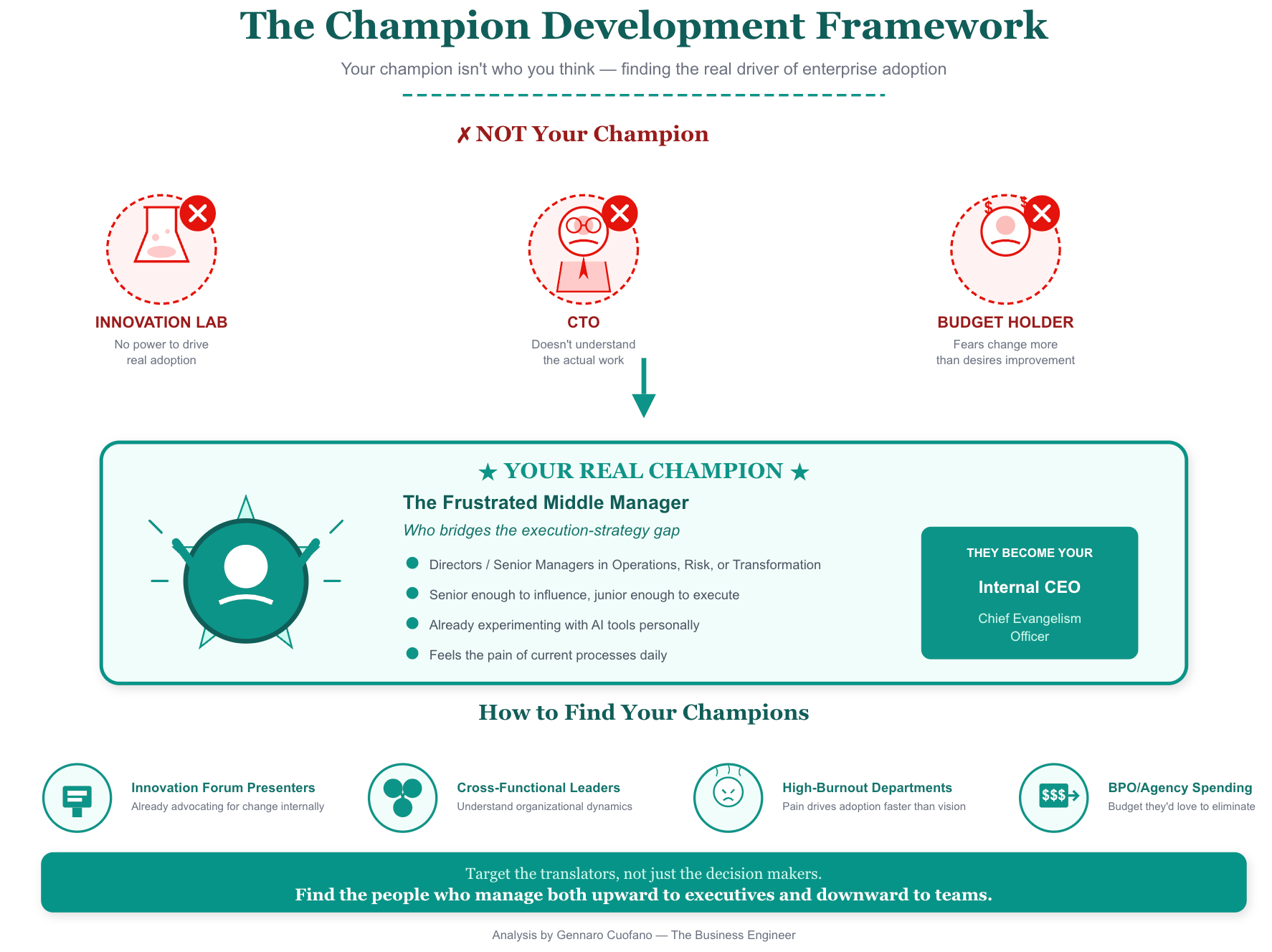 Your real champion is the frustrated middle manager who bridges the execution-strategy gap. They translate executive vision into operational reality. They have enough authority to run pilots but still understand frontline pain. They navigate both boardroom politics and daily workflows. Most critically, they can smooth friction between top-down mandates and bottom-up resistance.