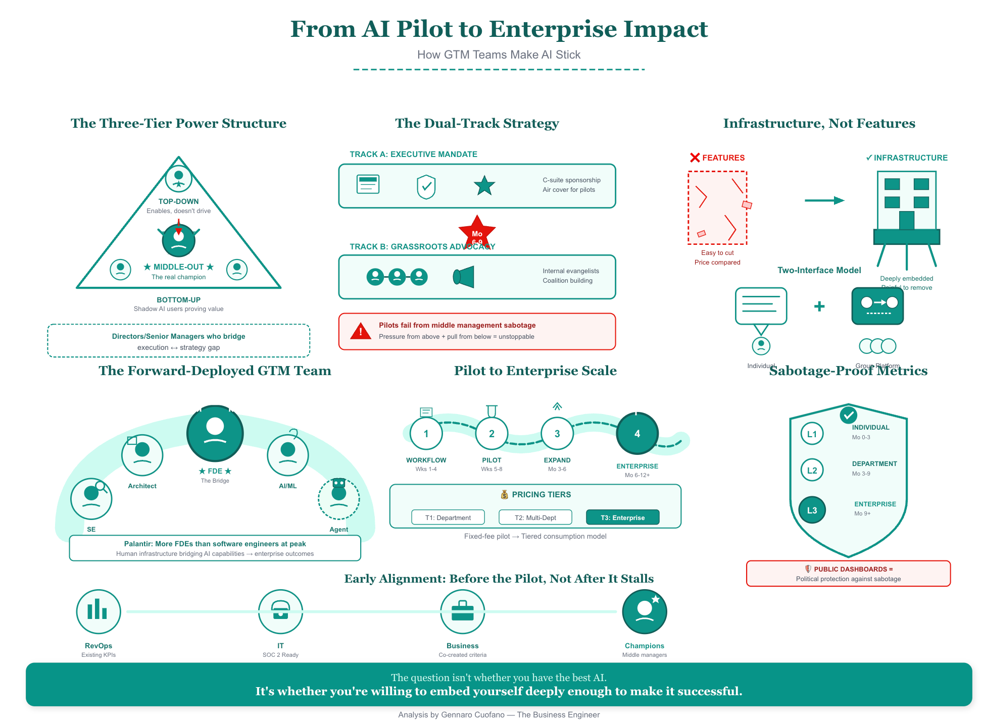In enterprise environments, AI pilots rarely fail because the technology doesn’t work. They fail because GTM teams aren’t organized to navigate complex buying committees, siloed ownership, and fragmented incentives. What starts as a successful pilot in one function often stalls before it reaches scale.