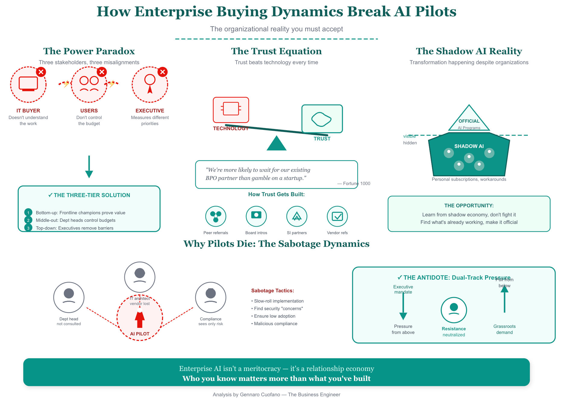 A procurement head at a Fortune 1000 company captured the reality perfectly: “We’re more likely to wait for our existing BPO partner to add AI than gamble on a startup.” This reveals the brutal truth: trust beats technology every time.