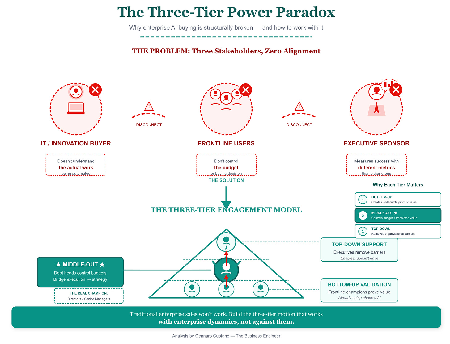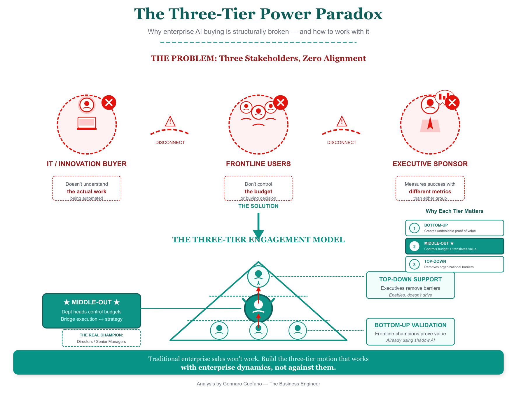 Your buyer in IT or Innovation doesn’t understand the work being automated. Your frontline users don’t control the budget. Your executive sponsor measures success using metrics that align with neither group’s priorities.