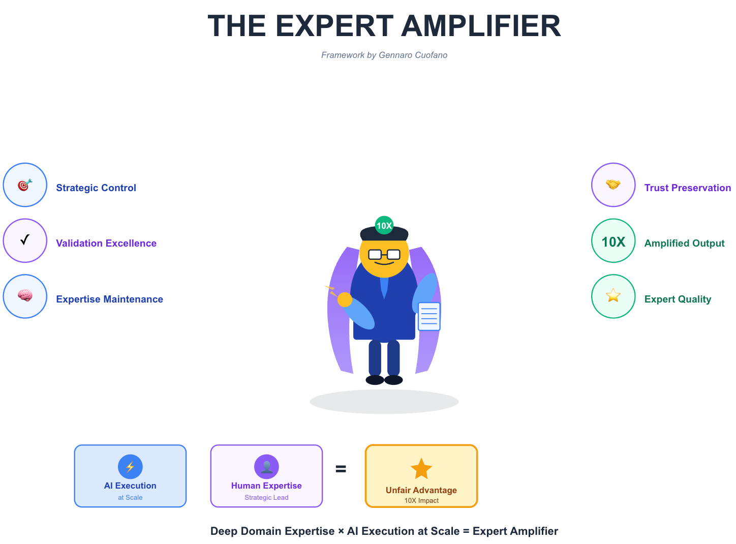 Expert Amplifiers combine deep domain expertise with AI mastery to operate at superhuman scale. They frame strategically, validate rigorously, and maintain expertise deliberately. They don’t compete on hours—they compete on impact. This is the future of high-value professional work. This is where you’re headed.