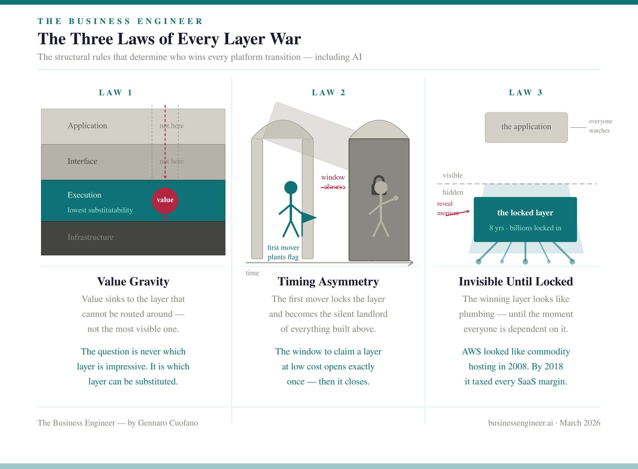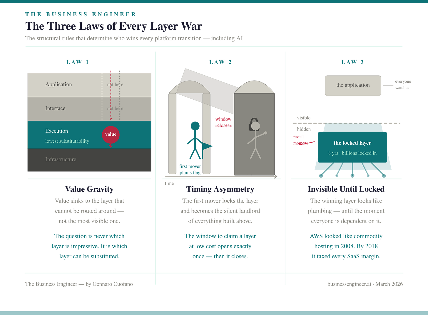 These three laws have a direct structural implication for AI: the battle that matters most right now is not being fought at the model layer. It is being fought at the layer below it.