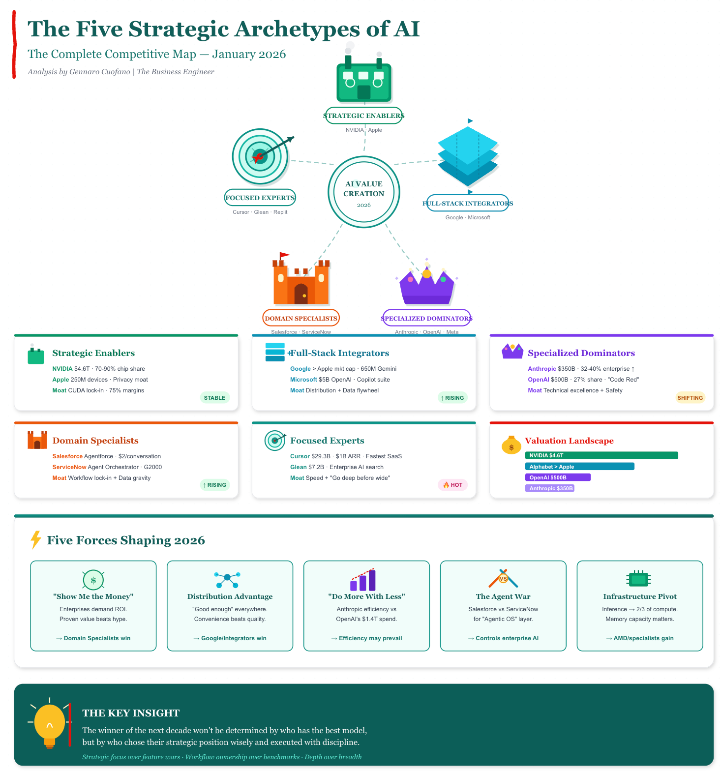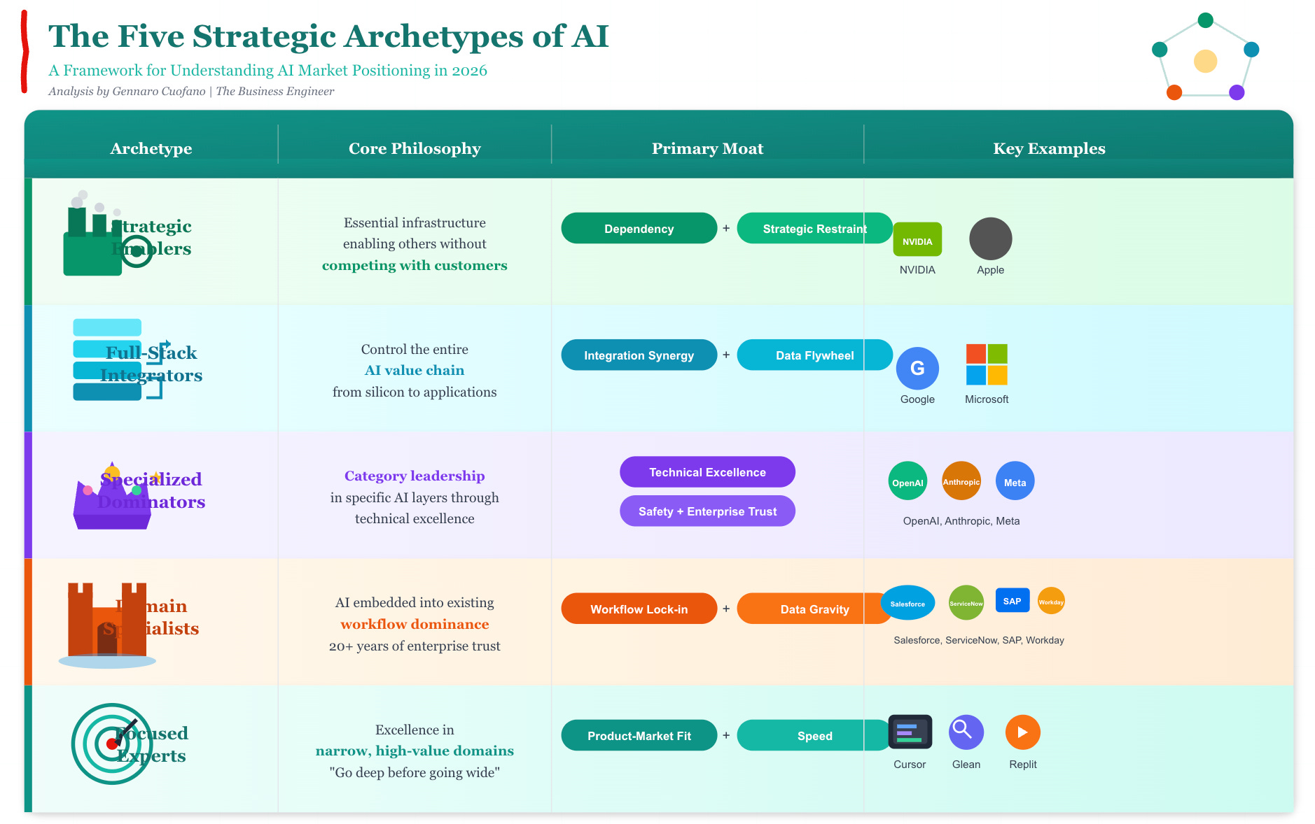 The AI competitive landscape has crystallized into five distinct strategic archetypes. Each represents a fundamentally different philosophy for creating and capturing value, and each has demonstrated market viability.