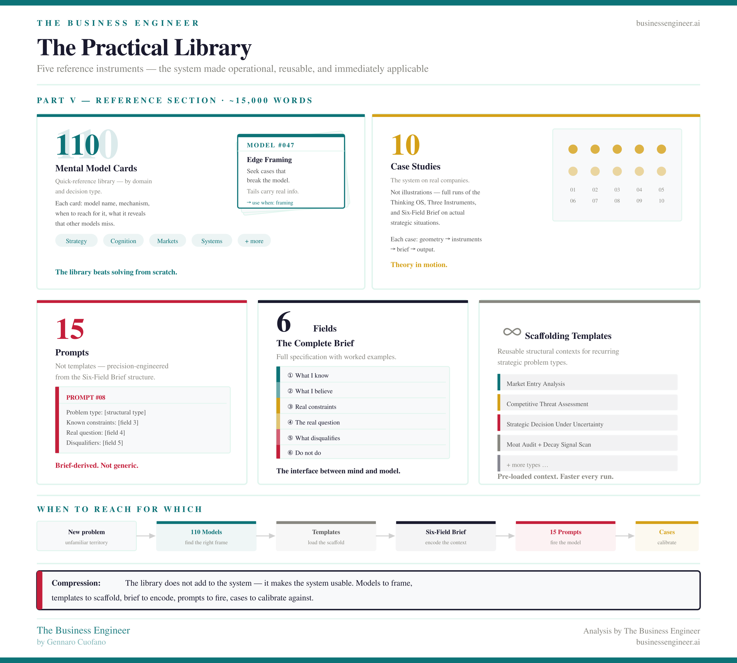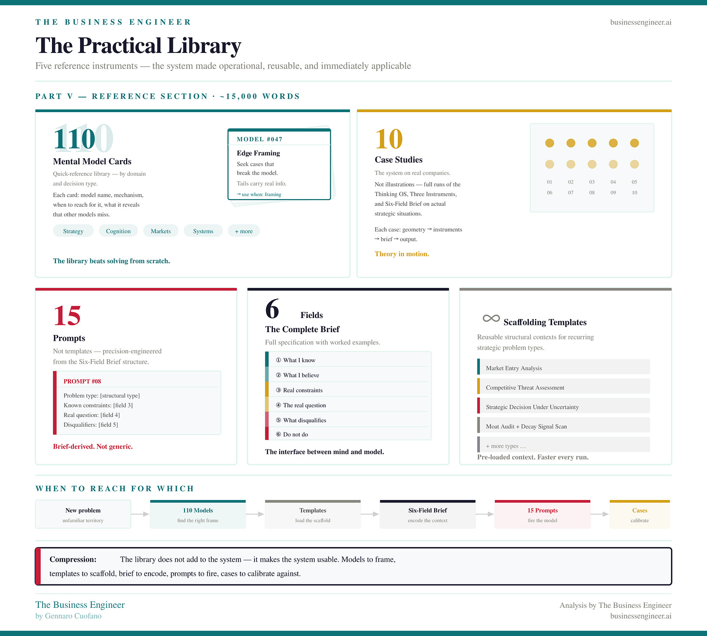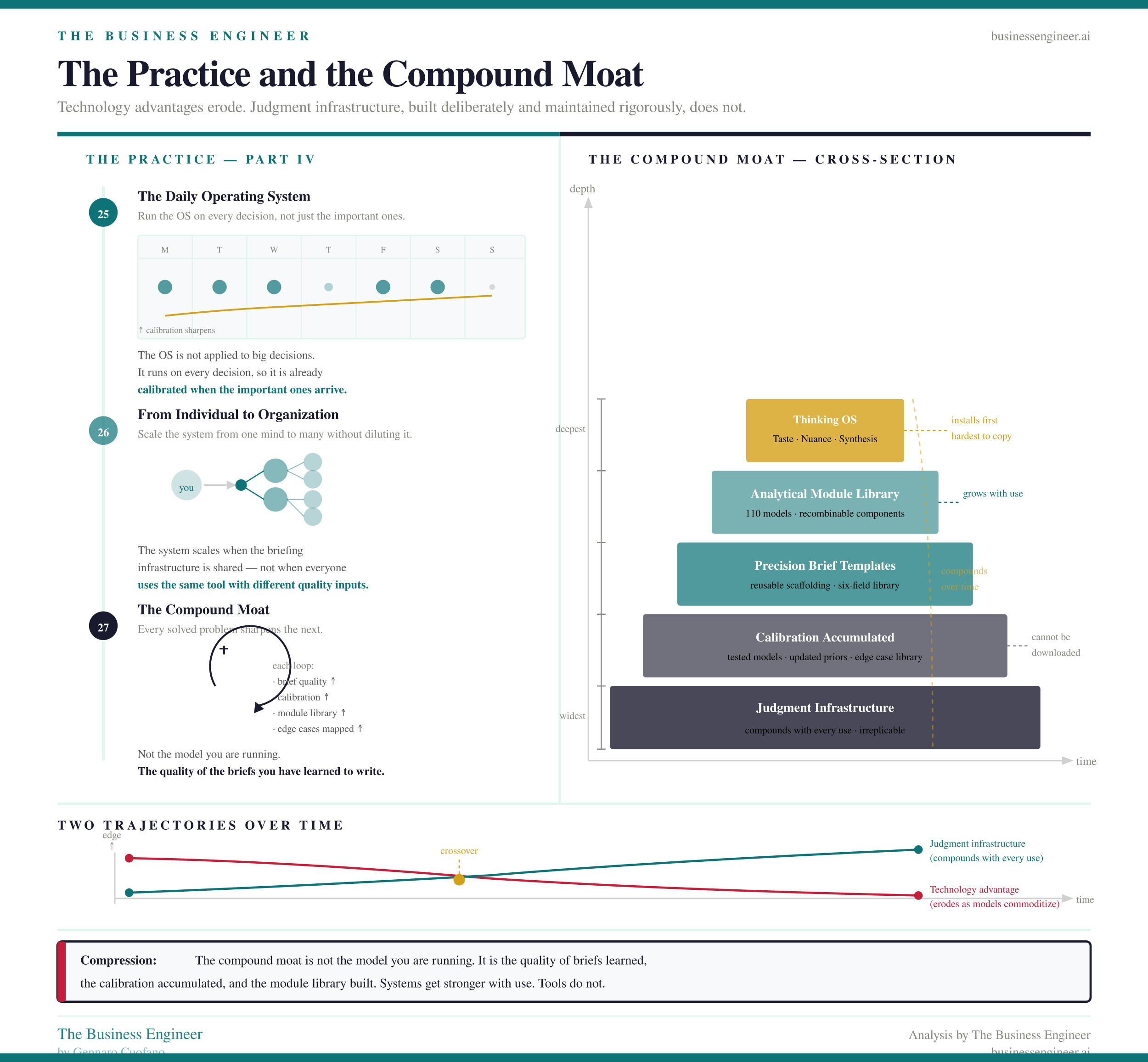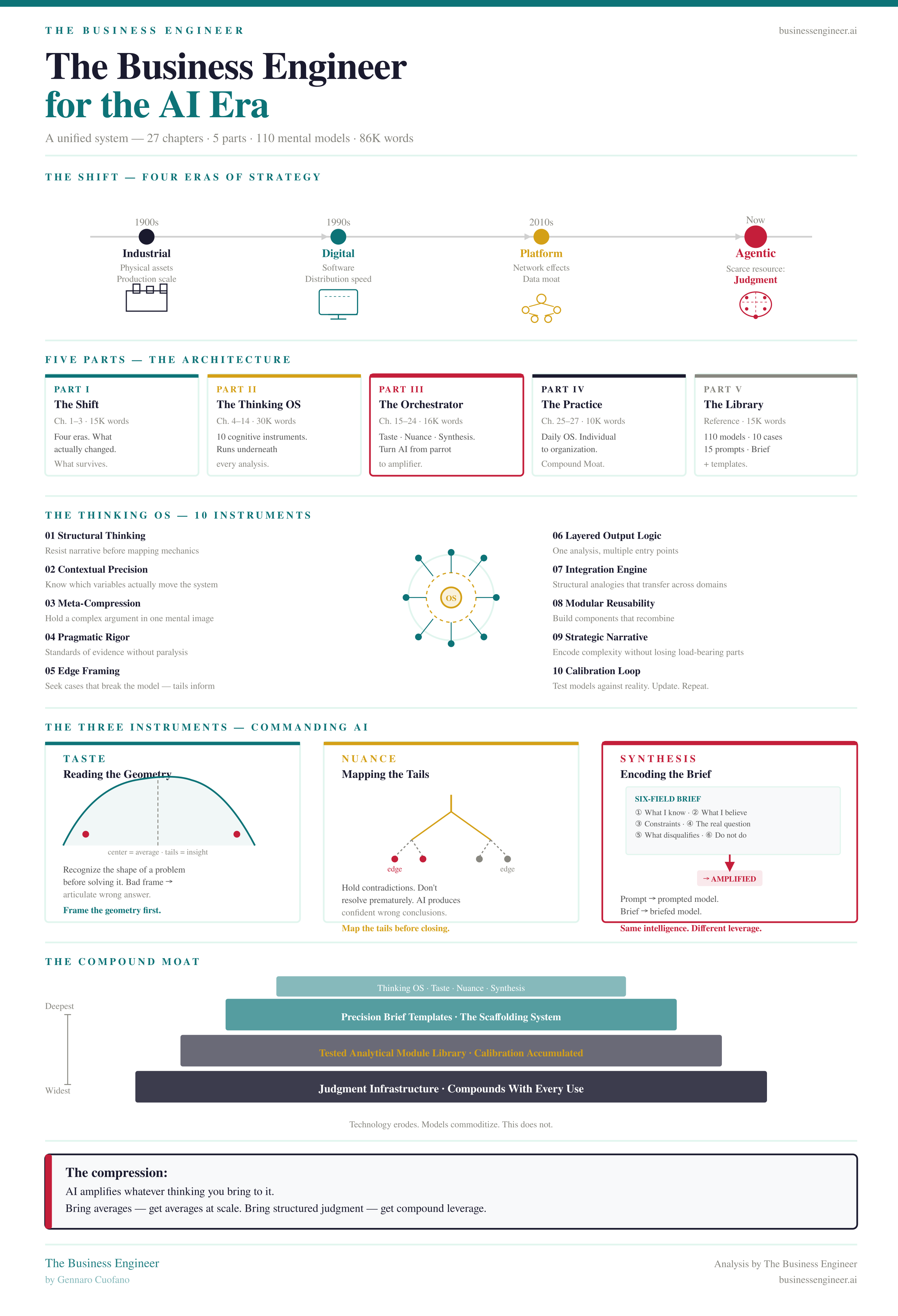 The compound moat — the book’s closing argument — is this: the organizations that will be hardest to compete with in five years are not the ones with the best models. Models are commoditizing. The ones that will be hardest to compete with are the ones that have built the best briefing infrastructure, the sharpest judgment about problem geometry, and the deepest library of tested analytical modules.